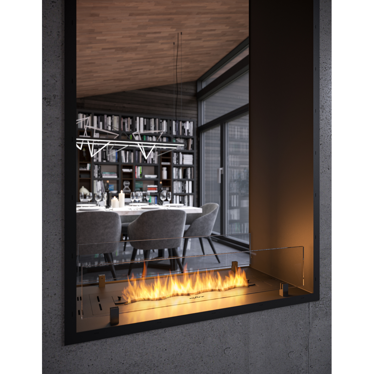 2SIDE 1200 Bioethanolkamin – Großer und Stilvoller Raumtrenner mit modernem Design Der 2SIDE 1200 Bioethanolkamin ist die perfekte Wahl für alle, die eine stilvolle und umweltfreundliche Feuerstelle suchen. Dieser hochwertige Einbaukamin ist speziell für den Einbau in eine Wand zwischen zwei Räumen konzipiert und dient als eleganter Raumtrenner. Dank der zweiseitigen Bauweise genießen Sie die faszinierende Flammenoptik aus beiden Räumen – ein Highlight für jedes moderne Wohnambiente.Flexible Anpassung für Ihr ZuhauseDie Tiefe des Kamins kann individuell zwischen 150 mm und 350 mm konfiguriert werden, sodass er sich ideal in Ihre Wohnsituation einfügt. Die Fertigungszeit für maßgeschneiderte Projekte beträgt 6 Wochen – sprechen Sie uns gerne für eine individuelle Lösung an.Vorteile des 2SIDE 1200 Bioethanolkamins✔ Kein Schornstein & genehmigungsfrei – Installation ohne bauliche Veränderungen möglich✔ Kein Rauch, Ruß oder Abgase – für ein sauberes und gesundes Raumklima✔ Für Innen- & Außenbereiche – vielseitig einsetzbar für Wohn- und Geschäftsräume✔ Sichere Nutzung – ausgestattet mit einem TÜV-geprüften Brenner und Sicherheitsglas✔ Hochwertige Verarbeitung – modernes Design aus pulverbeschichtetem Stahl in Schwarz Sicherheitsmerkmale🔥 Innovatives Entlüftungssystem – Verhindert Druckaufbau unter dem Brenner im Falle eines Kraftstoffüberlaufs.🔥 Zusätzlicher Sicherheitstank – Fängt überschüssiges Bioethanol auf und verhindert das Austreten von Brennstoff.🔥 Keramikfasereinlage – Erhöht die Sicherheit, verlängert und optimiert den Verbrennungsprozess.🔥 Einstellbare Flammenhöhe – Die längliche Regulierleiste mit zwei Griffen ermöglicht eine präzise Flammensteuerung.🔥 Sicheres Löschen – Dank einer verschiebbaren schwarzen Abdeckleiste kann das Feuer sicher gelöscht werden.🔥 Schutzglas – Das getönte Sicherheitsglas ist auf schwarzen Halterungen montiert und bietet zusätzlichen Schutz. Nachhaltig & umweltfreundlich🔥 Bioethanol ist eine nachhaltige und umweltfreundliche Energiequelle, die sauber und rückstandsfrei verbrennt. Es entstehen nur Wärme, Wasserdampf und minimale Mengen an CO₂, vergleichbar mit der Atemluft. Technische Details: Hersteller: InFire – Made in EUModell: InFire 2SIDE 1200 EinbaukassetteMaße: H 50,0 cm x B 120,0 cm x T 25,0 cmGewicht: 20 kgBrennerinhalt: 2 LiterBrenndauer: ca. 2 – 4 Stunden (je nach Flammeneinstellung)Wärmeabgabe: ca. 6 kWBrennergröße: 800 mm mit FlammenregulierungBrennstoff: Bioethanol (96 % Ethanolgehalt)Sicherheitsglas: Getönt, 4 mm, gehärtetMontage: Für Wandeinbau, benötigte Nische: 1160 mm x 460 mm x 250 mm Lieferumfang:✅ InFire 2SIDE 1200 Bio-Ethanol Kamin✅ Getöntes Sicherheitsglas (2 Stück, je 850 mm × 100 mm)✅ 1 Liter Bioethanol als Starterpaket