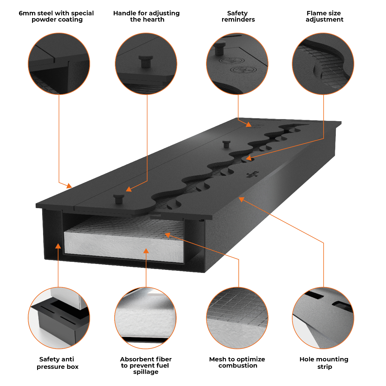 Die Slim Fire-Serie zeichnet sich durch eine elegante, schwarze Optik aus. Schwarze Rahmen und wellenförmige Brenner, geschützt durch starkes, gehärtetes Optiwhite-Glas, sorgen für eine stabile und stilvolle Konstruktion. Das minimalistische Design fügt sich harmonisch in jedes Interieur ein und wird zum perfekten Highlight Ihres Wohnraums.