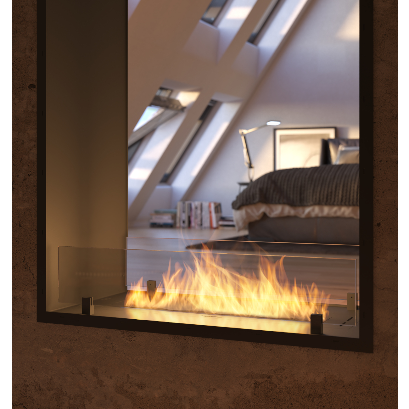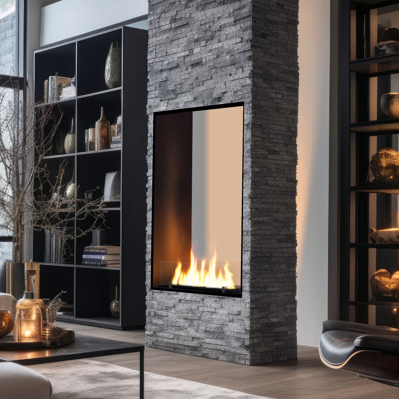 Mit seiner vertikalen Feueransicht, dem edlen Design und dem schmalen Blendrahmen ist der 2Side Vert Slim 1000 ideal für moderne Wohnräume, Lofts oder stilvolle Geschäftsbereiche. Er setzt markante Designakzente, verbindet Räume stilvoll miteinander und schafft eine gemütliche Atmosphäre.