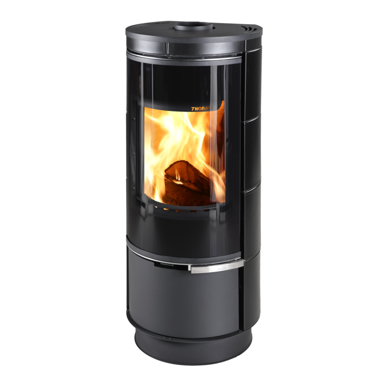 Unterhalb der Brennkammer befindet sich ein praktisches Holzfach mit Tür, das als Stauraum für Brennholz oder Kaminzubehör dient.