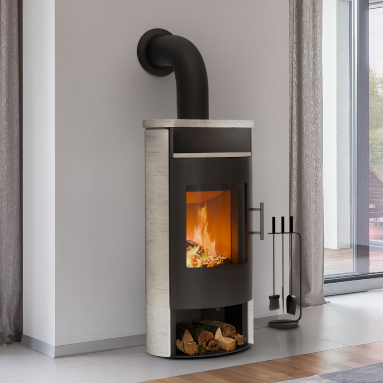 Neben der optischen Aufwertung bietet der Naturstein auch funktionale Vorteile: Er speichert die Wärme während des Betriebs und gibt sie über mehrere Stunden hinweg als angenehme Strahlungswärme an den Raum ab – selbst nachdem das Feuer bereits erloschen ist. Zudem zeichnet sich der Ivory-Stein durch eine hohe Biegefestigkeit und Kratzbeständigkeit aus, wodurch er besonders langlebig und formstabil ist.