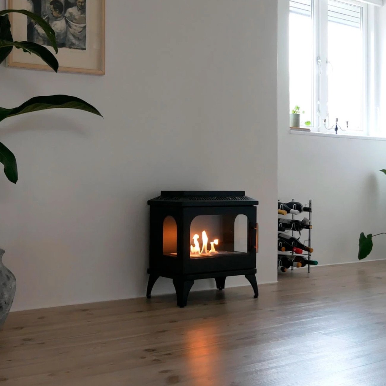 Bergen – Bioethanol-Kamin aus Gusseisen im skandinavischen Holzofen-Design Der ScandiFlames Bergen ist ein freistehender Bioethanol-Kamin aus robustem Gusseisen, inspiriert von traditionellen skandinavischen Holzöfen mit dekorativen Eisenakzenten und feinen Prägungen. Das klassische Design verleiht dem Kamin eine authentische und zugleich zeitlose Ausstrahlung. An der Vorderseite sorgt eine Tür mit integriertem Glasfenster für einen stimmungsvollen Blick auf die Flammen, während das massive Gusseisen Wärme besonders gut speichert und gleichmäßig abgibt. Leistungsstarker 1,5-Liter-Brenner mit regulierbarer Flamme Der mitgelieferte 1,5 Liter Premium-Bioethanol-Brenner ermöglicht eine Brenndauer von bis zu 5 Stunden pro Füllung und erreicht eine maximale Wärmeleistung von 2,1 kW. Individuell einstellbare Wärmeleistung Dank manueller Steuerung lässt sich die Flammengröße flexibel regulieren. So können Sie Wärmeabgabe und Brennstoffverbrauch optimal an Ihre Bedürfnisse anpassen. Kapazität: 1,5 Liter Brenndauer: bis zu 5 Stunden Wärmeleistung (max.): 2,1 kW Verbrauch: ca. 0,3 L/Stunde Flammenlänge: ca. 15 cm Abnehmbare dekorative Oberseite mit Kochfunktion Die dekorative Oberseite mit integriertem Griff kann für ein minimalistisches Erscheinungsbild abgenommen werden. Darunter befindet sich eine kleine Kochplatte, auf der sich beispielsweise ein Wasserkocher oder Teekessel erwärmen lässt – eine praktische Zusatzfunktion mit traditionellem Charme. Saubere und flexible Installation Der Bergen verwendet Bioethanol (95–97,5 %) als Brennstoff. Dabei entstehen weder Rauch noch Ruß oder Asche. Ein Schornstein oder Stromanschluss ist nicht erforderlich, was eine einfache und flexible Installation im Innenbereich ermöglicht. Maße & Gewicht Breite: 43,8 cm Höhe: 69,7 cm Tiefe: 38,7 cm Gewicht: 56 kg Mindestraumgröße: 40–50 m³ Technische Daten – ScandiFlames Bergen Brennstoff: Bioethanol 95–97,5 % Kapazität: 1,5 Liter Brenndauer: bis zu 5 Stunden Wärmeleistung: max. 2,1 kW Einstellbar: Ja Steuerung: Manuell Brennkammermodell: 1,5 Liter Premium Fernbedienung: Nein Material: Gusseisen Farbe: Schwarz Inklusive Scheibe: Ja Abzug/Schornstein: Nicht erforderlich Stromanforderungen: Nein Empfohlener Luftaustausch: 1 Im Lieferumfang enthalten Bergen Bioethanol-Kamin aus Gusseisen 1,5-Liter manueller Bioethanol-Brenner Betriebs- und Einstellwerkzeug Benutzerhandbuch Der Bergen Bioethanol-Kamin aus Gusseisen vereint traditionelle Handwerksoptik mit moderner, sauberer Verbrennungstechnologie und bietet eine stilvolle, langlebige und umweltfreundliche Heizlösung für Ihr Zuhause.