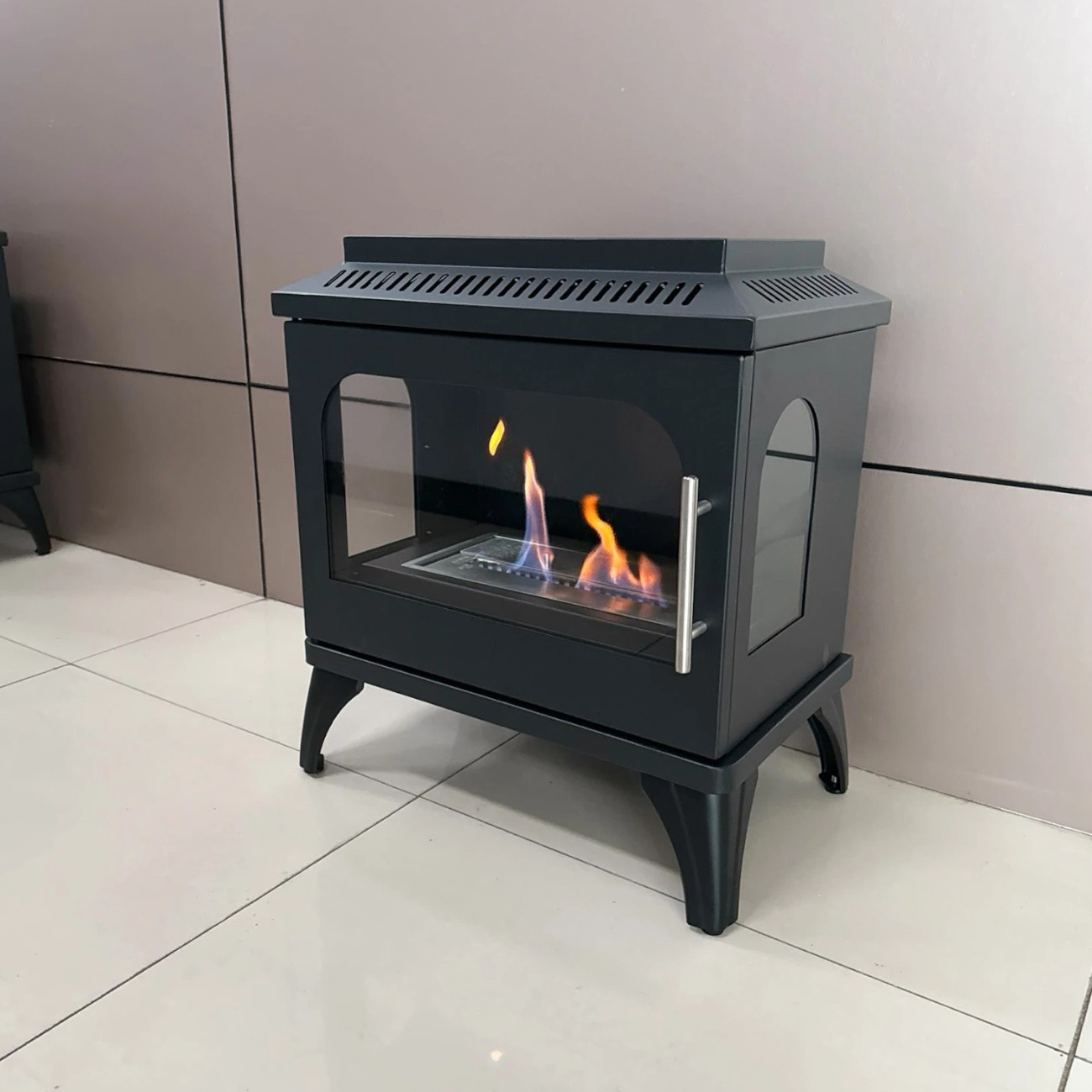 Lincoln Panorama Ethanol Kaminofen – Schwarz Der Lincoln Panorama Ethanol Kaminofen in Schwarz verbindet das klassische Design eines traditionellen Holzofens mit moderner Bioethanol-Technologie. Als freistehender Kaminofen sorgt er für eine gemütliche Atmosphäre und beeindruckende Flammen – ganz ohne Rauch, Ruß oder Asche. Durch seine elegante schwarze Oberfläche kommen die Flammen besonders intensiv zur Geltung und verleihen dem Raum eine stilvolle und warme Ausstrahlung. Der Kamin ist mit einer Sicherheitsglastür ausgestattet, die zusätzlichen Schutz bietet und gleichzeitig eine klare Sicht auf das Feuer ermöglicht. Mit einer Brenndauer von bis zu 4,5 Stunden pro Füllung Bioethanol genießen Sie langanhaltende Flammen und eine angenehme Wärme. Im unteren Bereich befindet sich eine praktische Ablage, die beispielsweise zur Aufbewahrung von Brennholz oder dekorativen Elementen genutzt werden kann. Dadurch entsteht eine authentische Holzofen-Optik, die sich sowohl in moderne als auch klassische Wohnräume harmonisch einfügt. Freistehender Ethanol Kamin im Holzofen-Design Der Lincoln Panorama Ethanol Kaminofen kombiniert eine klassische Ofenoptik mit den Vorteilen moderner Bioethanol-Technologie. Da kein Schornstein und kein Stromanschluss erforderlich sind, lässt sich der Kamin flexibel im Wohnraum platzieren und einfach in Betrieb nehmen. Die saubere Verbrennung von Bioethanol sorgt für eine umweltfreundliche Feuerstelle mit minimalem Wartungsaufwand. Highlights Sicherheitsglas in der Tür für zusätzliche Sicherheit Brenndauer bis zu 4,5 Stunden mit einer Füllung Inklusive Löschwerkzeug für sichere Handhabung Kein Stromanschluss erforderlich Kein Abzug oder Schornstein notwendig Praktische Ablagefläche im unteren Bereich Elegantes Holzofen-Design mit moderner Bioethanol-Technologie Maße & Gewicht Länge/Breite: 50 cm Höhe: 98 cm Tiefe: 30 cm Gewicht: 28 kg Technische Spezifikationen Mindestraumgröße: 45 m³ Brennstoff: Bioethanol 95–97,5 % Brenndauer: bis zu 4,5 Stunden Kapazität: 1 Liter Wärmeleistung (max.): 1,9 kW Verbrauch: ca. 0,22 L/Stunde Brennkammer Steuerung: Manuell Einstellbar: Ja Brennkammermodell: 1,0 Liter Deluxe Fernbedienung: Nein Material & Aussehen Material: Stahl und Glas Farbe: Schwarz Flammensicht: Front, rechte Seite, linke Seite Inklusive Scheibe: Ja Installation Abzug/Schornstein: Nicht erforderlich Stromanschluss: Nicht erforderlich