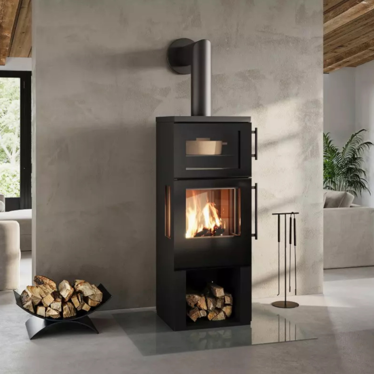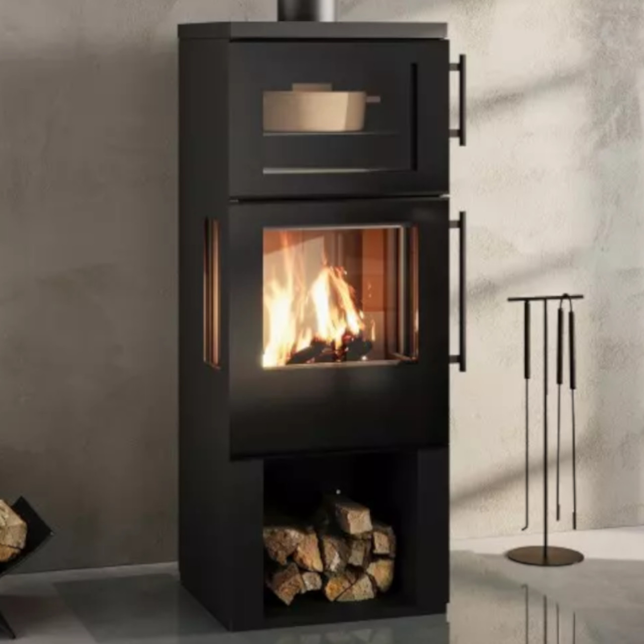 Praktische Details wie die Aschelade hinter der Feuerraumtür, integrierte Konvektionsluftöffnungen in der Abdeckung sowie der serienmäßige Stangengriff an Backfach- und Feuerraumtür machen die Nutzung besonders komfortabel. Optional ist der Kaminofen auch mit einer Holzfachtür erhältlich – ganz nach Ihren individuellen Wünschen.