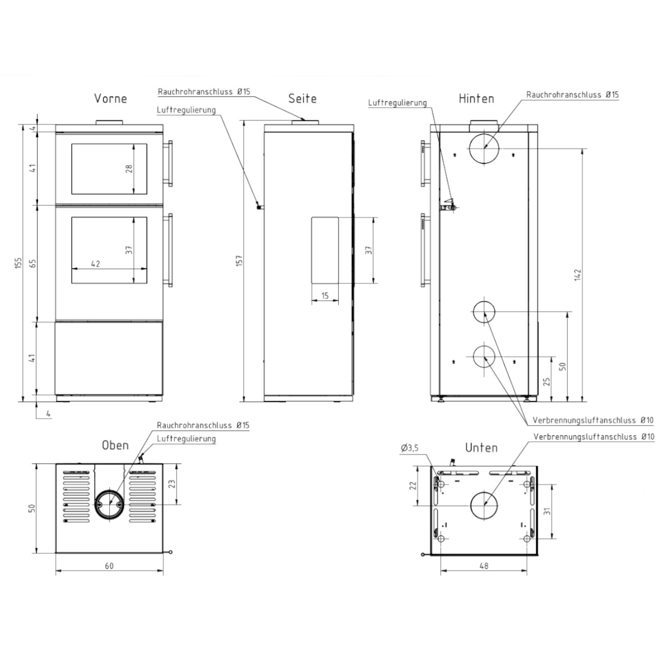 - Abstand von Mitte des Rauchstutzens bis zur Hinterkante des Ofens: 23 cm