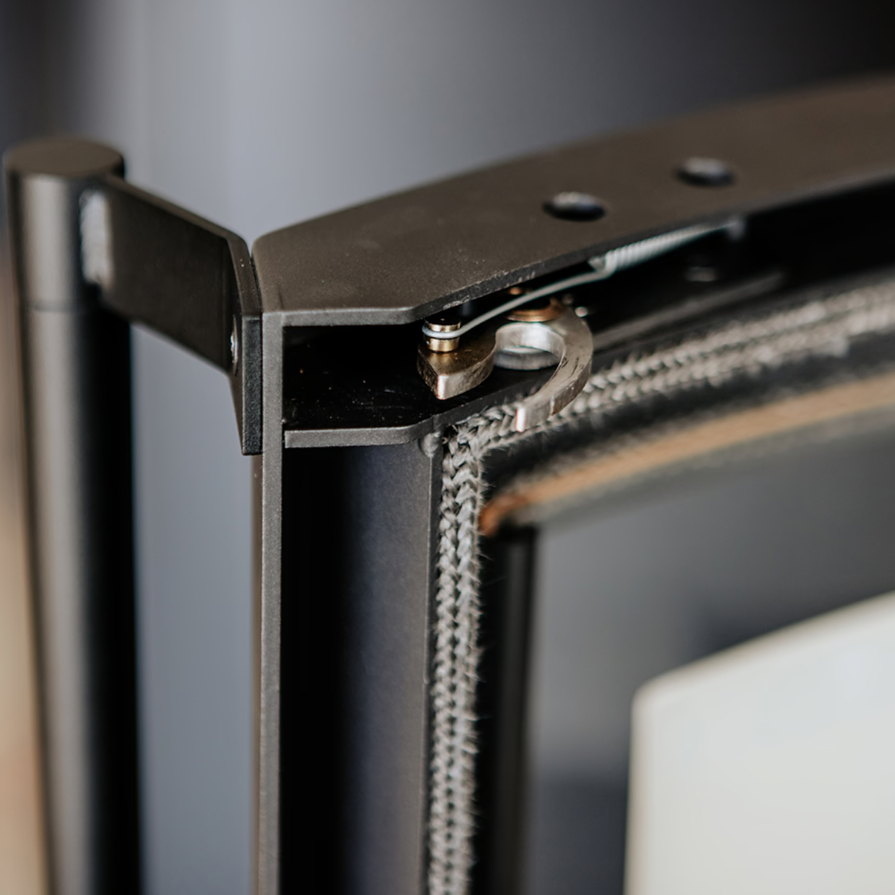 - Rahmenlose Designscheibe: Die Glasscheibe befindet sich vor dem Rahmen, dadurch wirkt die Glasscheibe größer und der Kamin eleganter