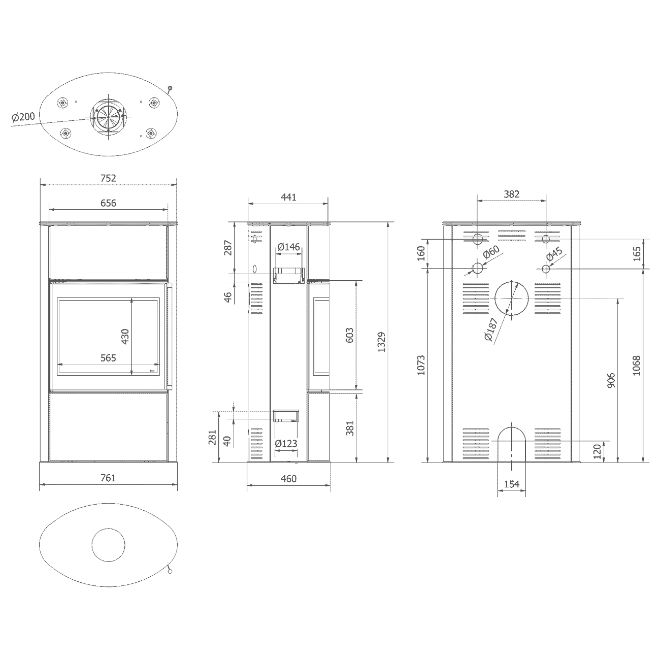 - Position Rauchrohranschluss: Oben; Hinten (bei Wärmespeicherung immer Anschluss Oben benutzen)