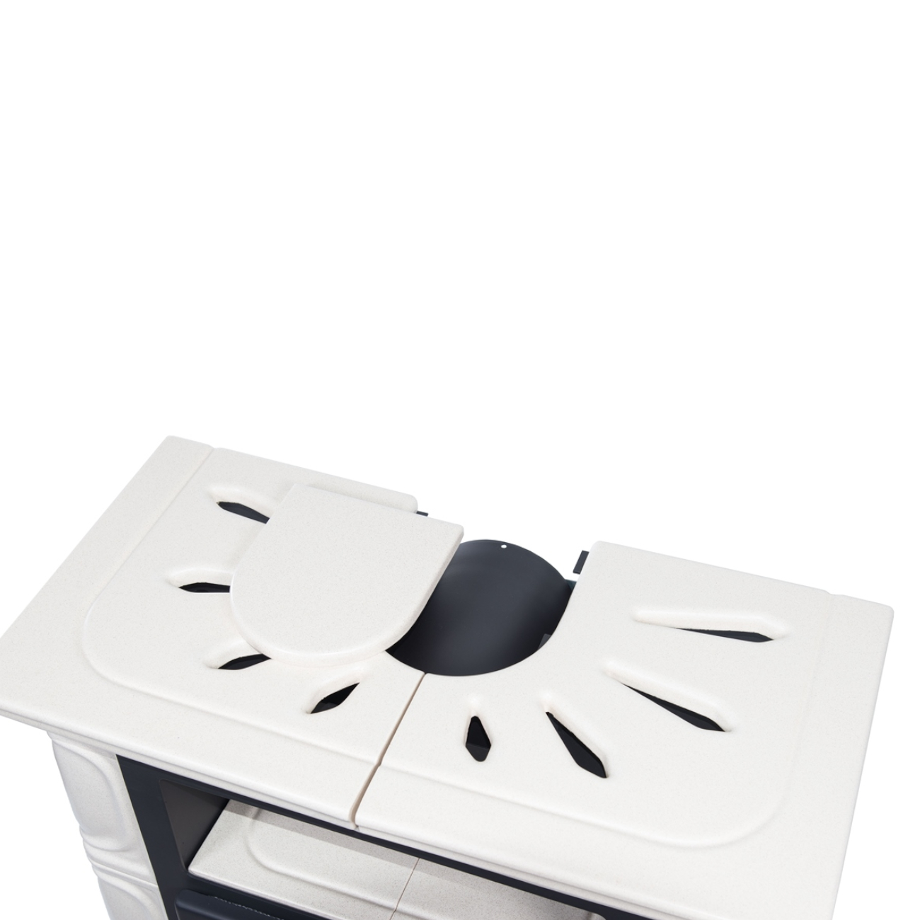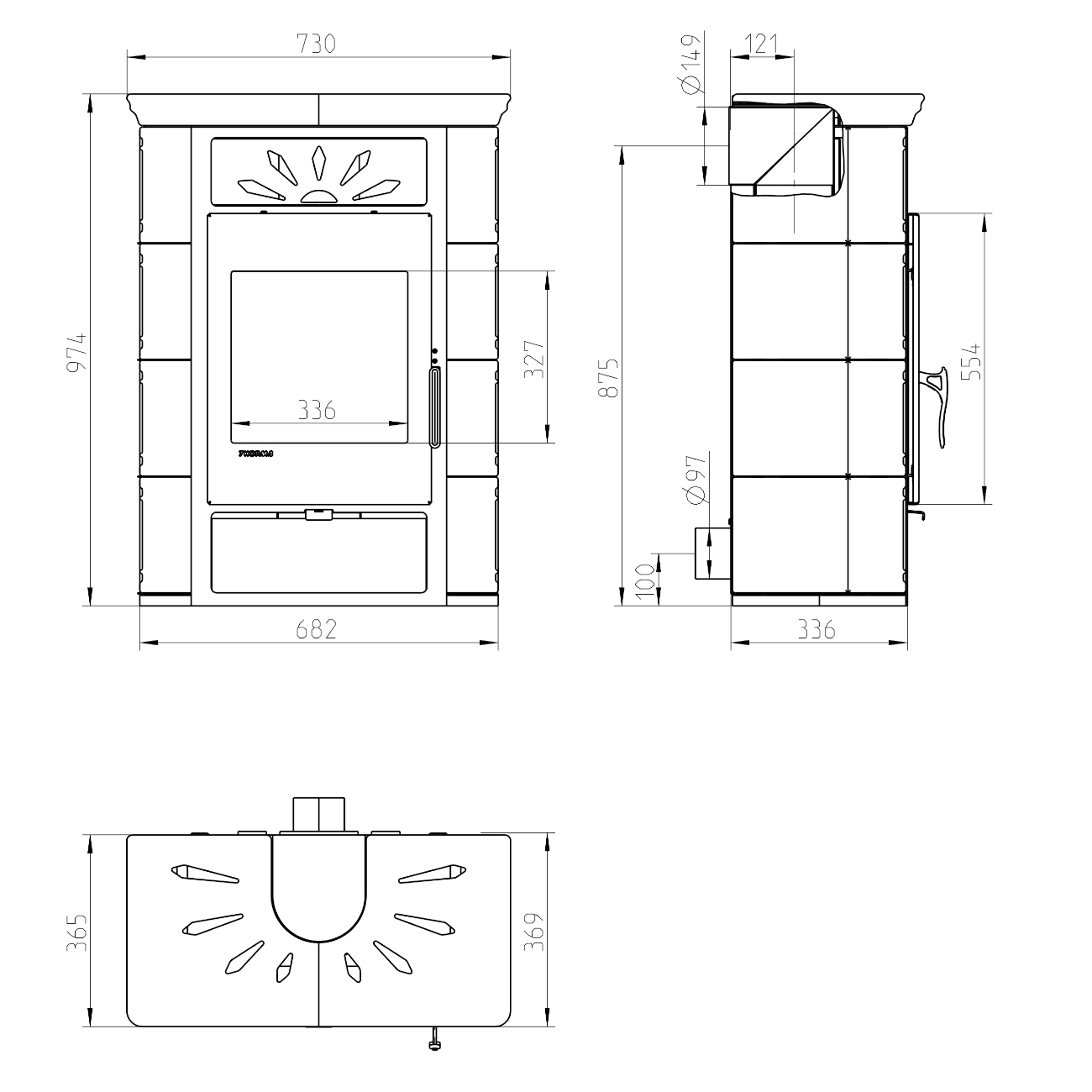 - Abstand von Mitte des Rauchstutzens bis zur Hinterkante des Ofens: 12,1 cm