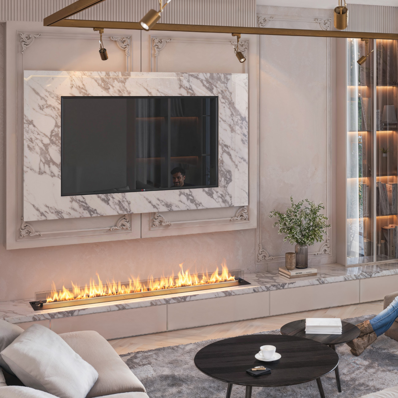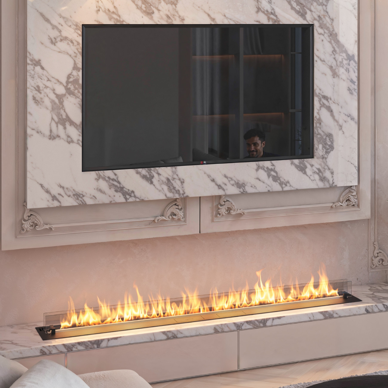 BURNER 1500 ETRONIC PREMIUM Automatischer Ethanolbrenner – luxuriöser Bioethanol Einbaubrenner Der BURNER 1500 ETRONIC PREMIUM automatische Ethanolbrenner von InFire (Made in EU) steht für Premium-Qualität, höchste Sicherheit und maximalen Bedienkomfort. Mit seiner extra breiten Feuerlinie und der gesteigerten Heizleistung ist dieses Modell bestens für mittelgroße bis große Räume geeignet und setzt eindrucksvolle Akzente in modernen Wohnkonzepten. Der ETRONIC PREMIUM vereint innovative Technik mit elegantem Design und bietet ein luxuriöses Feuererlebnis ohne Rauch, Ruß oder Schornstein. Die Montage auf Kommoden, Tischen, TV-Wänden, Cinewalls oder in individuellen DIY-Projekten ist einfach und flexibel realisierbar. Serienmäßig ausgestattet mit 8 mm starkem OPTIwhite-Sicherheitsglas erfüllt der Brenner höchste ästhetische und funktionale Ansprüche. Automatischer Bioethanol Brenner für mittelgroße & große Räume Der BURNER 1500 ETRONIC PREMIUM kombiniert echtes Feuer mit modernster Steuerungstechnologie. Er nutzt flüssigen Bioethanol und erzeugt eine besonders ruhige, gleichmäßige und elegante Flamme mit beeindruckender Breite. Das Zünden und Löschen erfolgt vollautomatisch – über das versteckte Touchpad direkt am Kamin oder bequem per serienmäßiger Fernbedienung. REAL FIRE UNDER CONTROL – echtes Feuer ohne Schornstein Bioethanol verbrennt sauber und nahezu rückstandsfrei. Es entstehen kein Rauch, kein Ruß und keine Asche, sondern lediglich Wasserdampf und eine geringe Menge CO₂. Der BURNER 1500 ETRONIC PREMIUM ist damit eine umweltfreundliche, genehmigungsfreie Alternative zu klassischen Kaminen – ganz ohne Schornstein oder Rauchabzug. Warum den BURNER 1500 ETRONIC PREMIUM wählen? Zuverlässige Heizleistung & harmonische Feuerlinie Heizleistung bis 9,9 kW 1.400 mm lange Feuerlinie für eine gleichmäßige, elegante Flammenwirkung Flammenhöhe bis zu 25 cm Ideal für mittelgroße bis große Räume 10 verschiedene Flammenhöhenstufen Premium-Bedienkomfort Verstecktes Touchpad direkt am Kamin Fernbedienung serienmäßig inklusive Vollautomatisches Ein- und Ausschalten Fein justierbare Flammensteuerung Automatisches & sicheres Nachfüllsystem Der BURNER 1500 ETRONIC PREMIUM verfügt über ein externes, automatisches Nachfüllsystem mit elektrischer Pumpe. Die Brennerkassette wird sicher und präzise mit Bioethanol versorgt – vollautomatisch und ohne direkten Kontakt mit dem Brennstoff. Sicherheitsfunktion: Etwa 30 Minuten nach Erlöschen der Flammen blockiert der Kamin den Befüllvorgang automatisch, solange die Innentemperatur noch zu hoch ist. Der Füllvorgang wird erst bei sicherer Temperatur freigegeben. Kein Überfüllungsrisiko Kein Verschütten von Bioethanol Sauberer, schneller Tankvorgang (ca. 2–5 Minuten) Maximale Sicherheit & Komfort Intelligente Sicherheit durch 7 Sensoren CO₂-Sensor Temperatursensor Störsensor Seismologischer Sensor Überlaufsensor Kraftstoffspannungssensor Sicherheitssensor des Betankungssystems Flexibler Einbau mit Premium-Sicherheitsausstattung Der BURNER 1500 ETRONIC PREMIUM wird inklusive 2 Stück OPTIwhite Sicherheitsglas geliefert: Farblos / durchsichtig (OPTIwhite-Technologie) 8 mm starkes, gehärtetes Sicherheitsglas Flexible Gestaltung – wahlweise 1 oder 2 Gläser montierbar Maße je Glas: 1140 x 100 mm Technische Daten – BURNER 1500 ETRONIC PREMIUM Außenmaße: 1500 x 290 x 194 mm (+ 108 mm) Einbauöffnung: 1490 x 290 x 210 mm Feuerlinie: 1400 mm Tankkapazität: 9,8 Liter Brenndauer: ca. 2,5 – 8 Stunden Heizleistung: bis 9,9 kW Kraftstoffart: Bioethanol max. 96,6 % Materialien: Stahl, pulverbeschichteter Stahl (Edelstahl), Aluminium Farbe: Schwarz Gewicht: 46 kg Hersteller: InFire – Made in EU Sicherheits- & Nutzungshinweise Wichtige Hinweise für den sicheren Betrieb Mindestabstand zu brennbaren Materialien: 1 m Mindestens 60 cm freier Luftraum über der Brennerkassette erforderlich Mindestraumgröße: 50 m² Nicht bei Zugluft betreiben Nicht starten bei Raumtemperaturen unter 17 °C Nach dem Entzünden nicht bewegen – automatische Sperre für 24 Stunden BURNER 1500 ETRONIC PREMIUM – luxuriöser, automatischer Bioethanol Brenner für großzügige Wohnräume, exklusive Designprojekte und kompromisslosen Bedienkomfort.