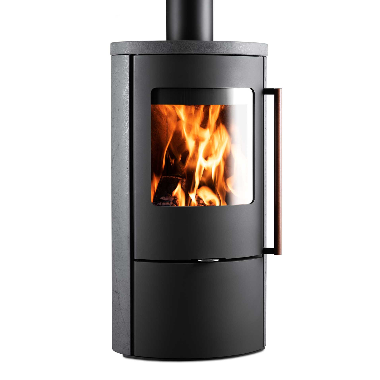 Zusätzlich überzeugt der Kaminofen durch einen edlen Türgriff aus Holz (Buchenholz in Nussbaumoptik) oder alternativ in Edelstahl, passend zu Ihrem Wohnstil.