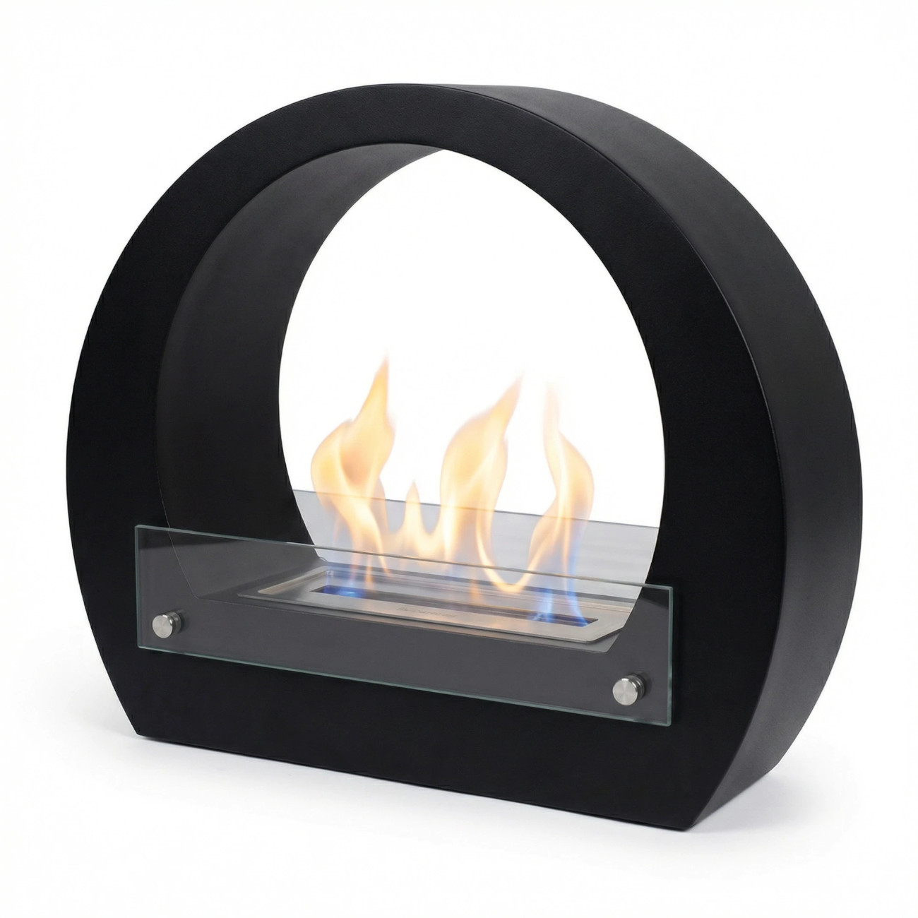 Der charakteristische, große Bogen umschließt das faszinierende Flammenspiel und ermöglicht eine freie Sicht von beiden Seiten. Zwei integrierte Schutzgläser sorgen für zusätzliche Sicherheit und schützen die Umgebung, ohne die Sicht auf das Feuer einzuschränken. Der schwarze Stahlkorpus bildet dabei einen edlen Kontrast zu den lebendigen Flammen.