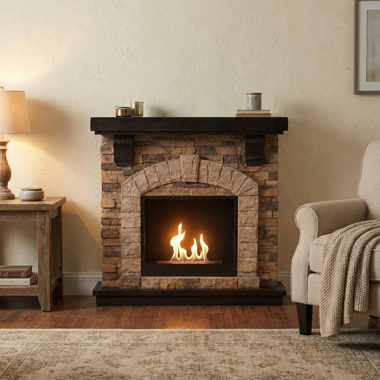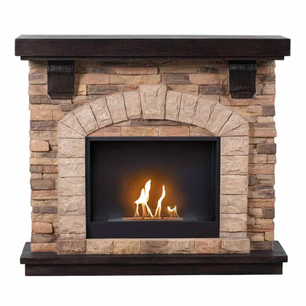 Der massive Polystone-Rahmen ist mit einer detailreichen Oberflächenstruktur gestaltet, die klassische Backsteinmauern imitiert. Die warmen Naturtöne aus Braun- und Sandfarben verleihen dem Kamin eine traditionelle, rustikale Ausstrahlung.