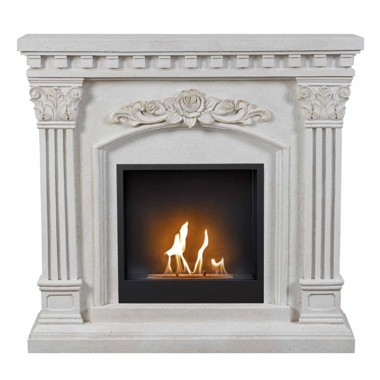 Der massive Rahmen besteht aus Polystone MGO mit authentischer Steinoptik und detailreichen klassischen Ornamenten. Schlanke Säulen und ein von Blumen inspiriertes Kronelement sorgen für ein harmonisches Gesamtbild und machen den Kamin zu einem stilvollen Blickfang im Raum.
