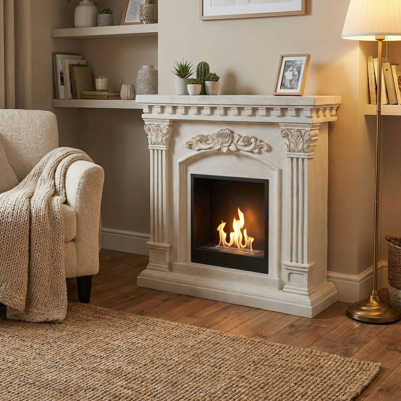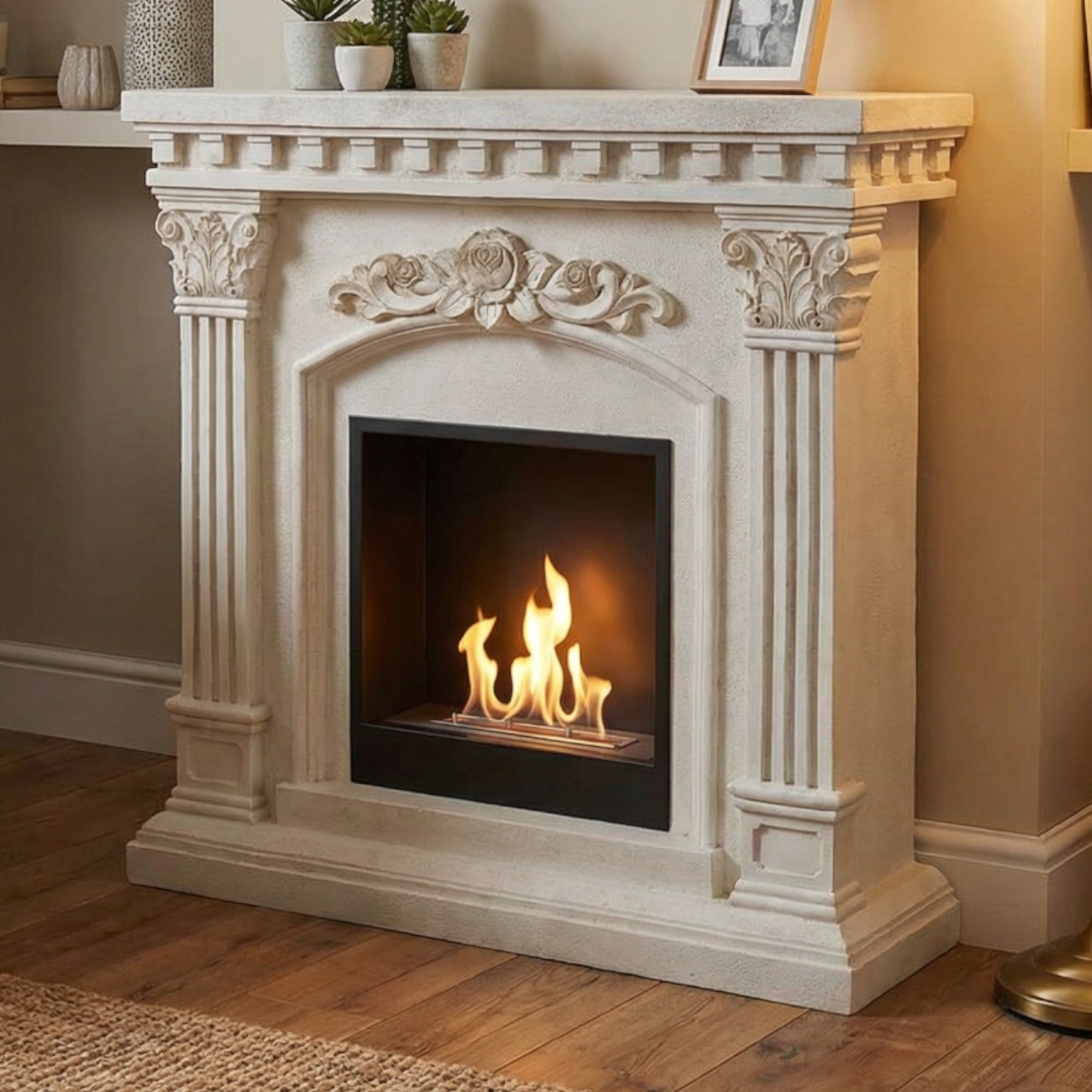 Der ScandiFlames Freyr ist ein freistehender Bioethanol-Kamin, der klassisches Kamin-Design mit moderner Bioethanol-Technologie verbindet. Die dekorative Polystone-Umrandung mit eleganten Säulen und floralen Verzierungen – darunter fein gestaltete Rosenblumen-Ornamente – verleiht dem Kamin eine besonders elegante und klassische Ausstrahlung.