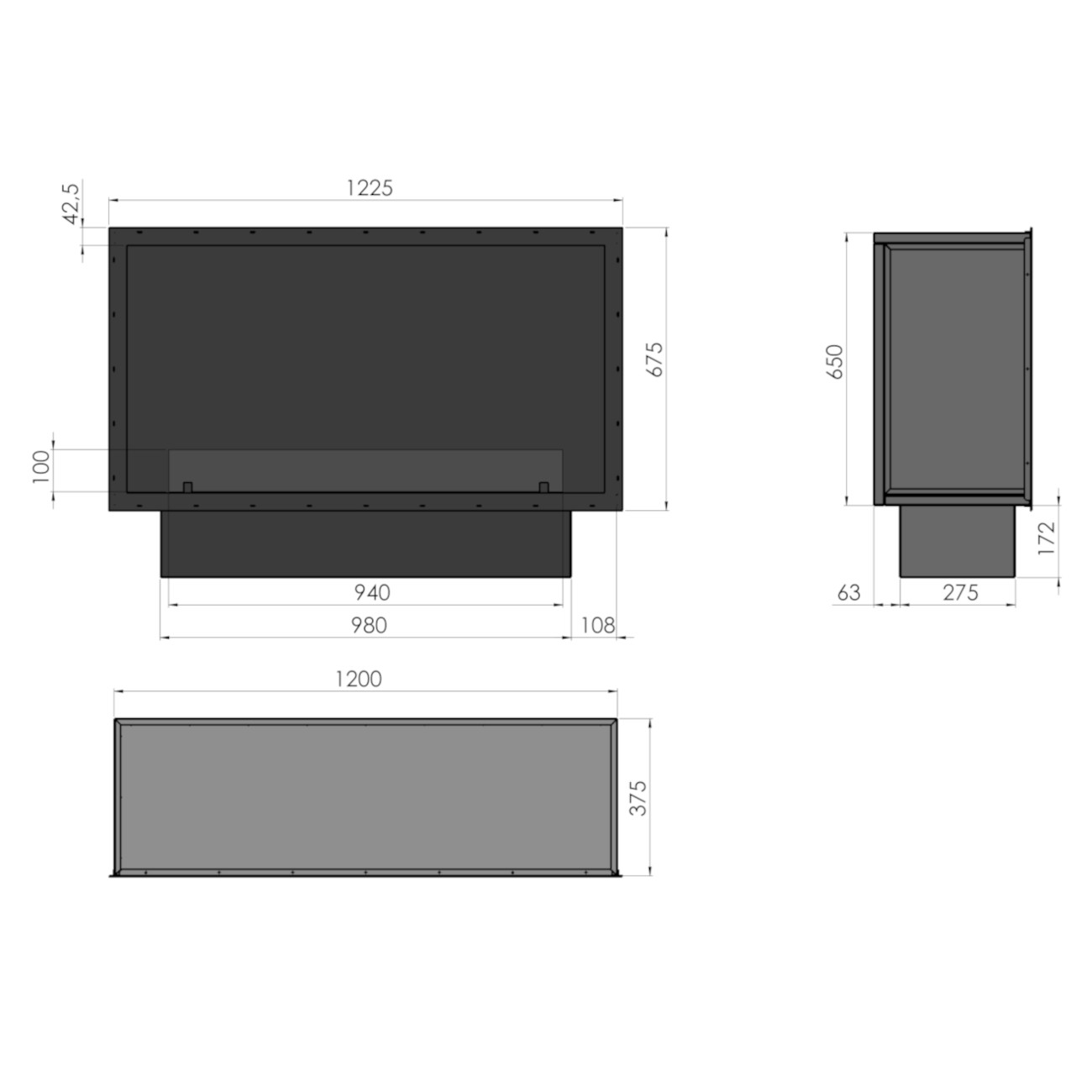 - Maße Kaminkassette: 1225 x 675 x 375 mm (B x H x T)