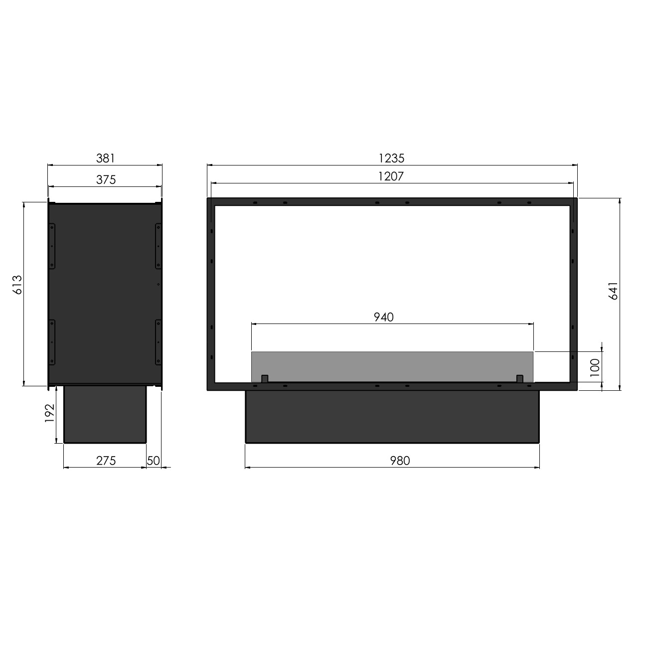 - Maße Kaminkassette: 1235 x 660,2 x 381 mm (B x H x T)