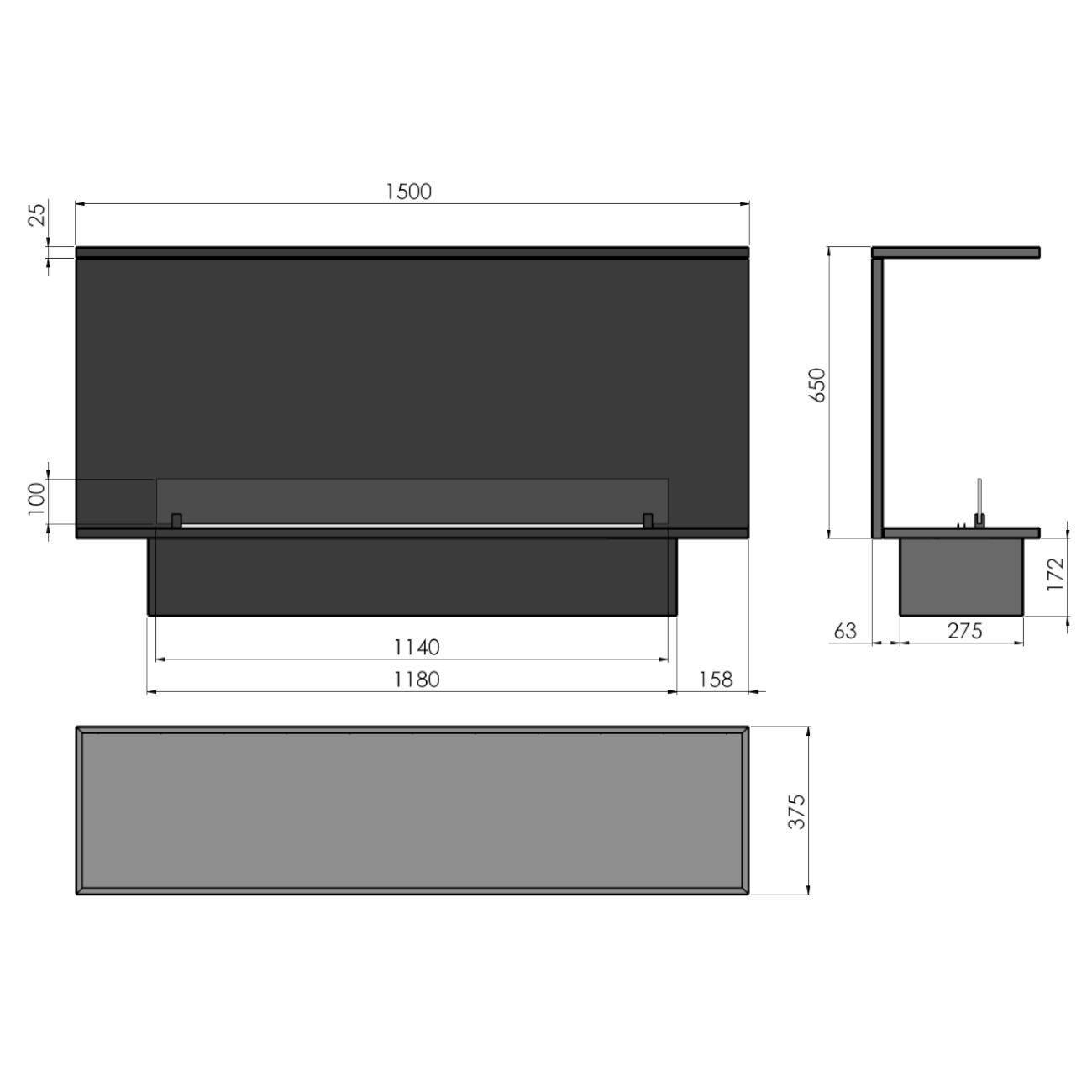 - Maße Kaminkassette: 1500 x 650 x 375 mm (B x H x T)