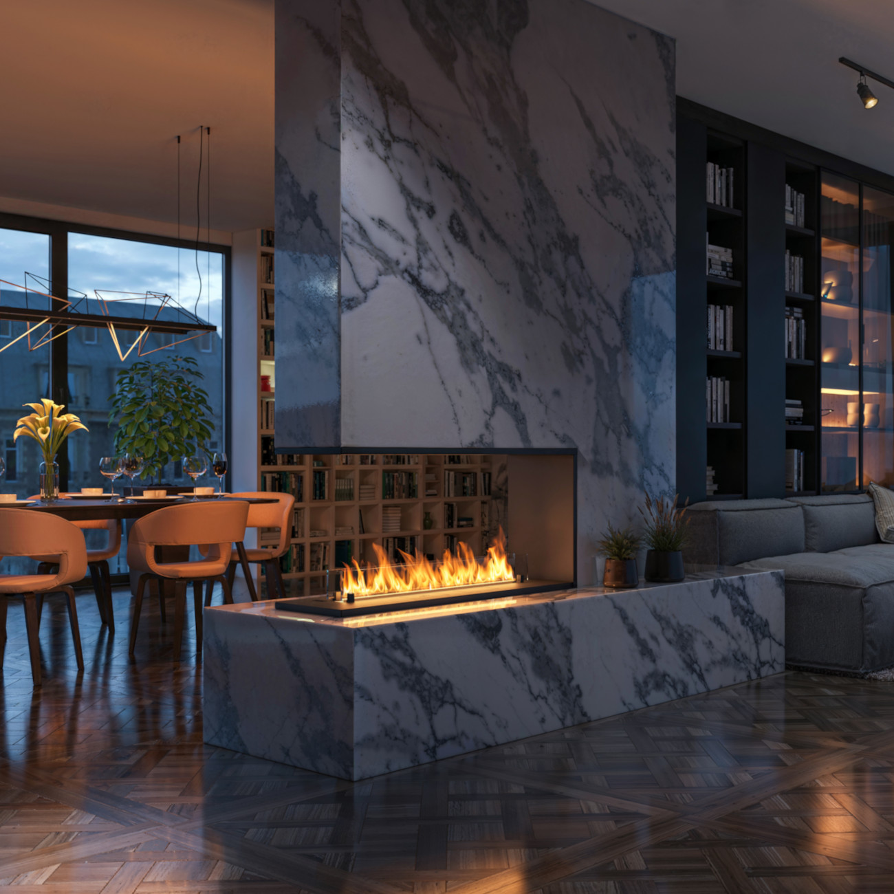 INSIDE U1200 ETRONIC PREMIUM Panorama – die automatische Bioethanol-Kaminkassette in U-Form mit 3-seitiger Feuersicht, ideal als Raumtrenner für moderne Wohnkonzepte und offene Architektur.