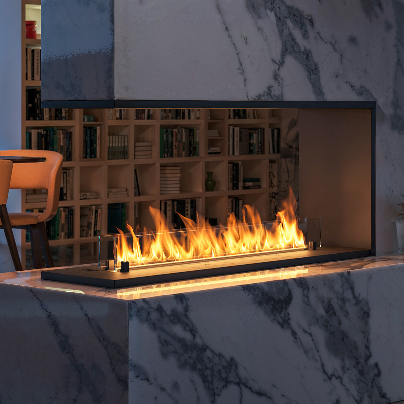 Die 3-seitige, U-förmige Panorama-Ausführung zieht das Feuer förmlich in den Raum hinein. Als Raumtrenner eingesetzt, bleibt der Blick durch den Raum erhalten, während das Flammenspiel gleichzeitig Struktur, Wärme und Atmosphäre schafft.