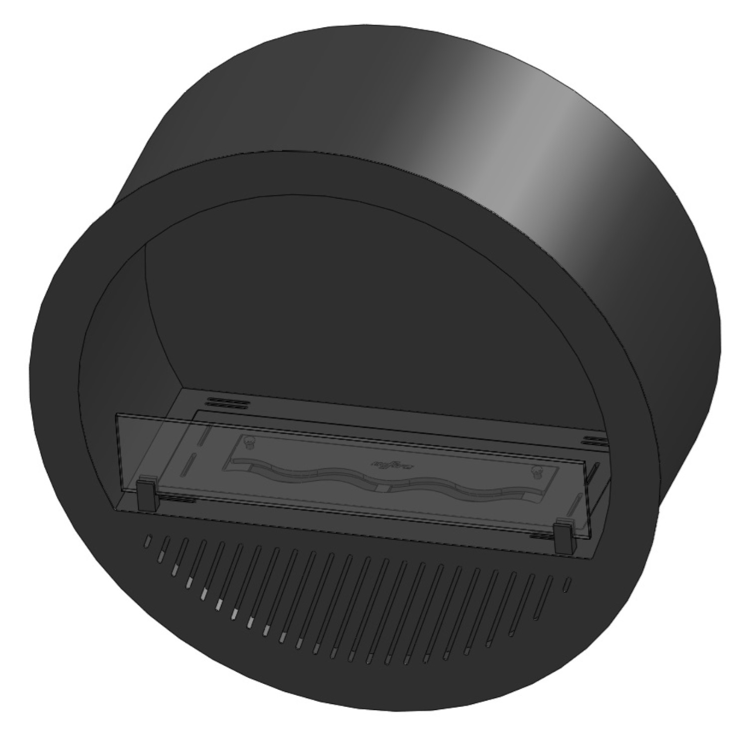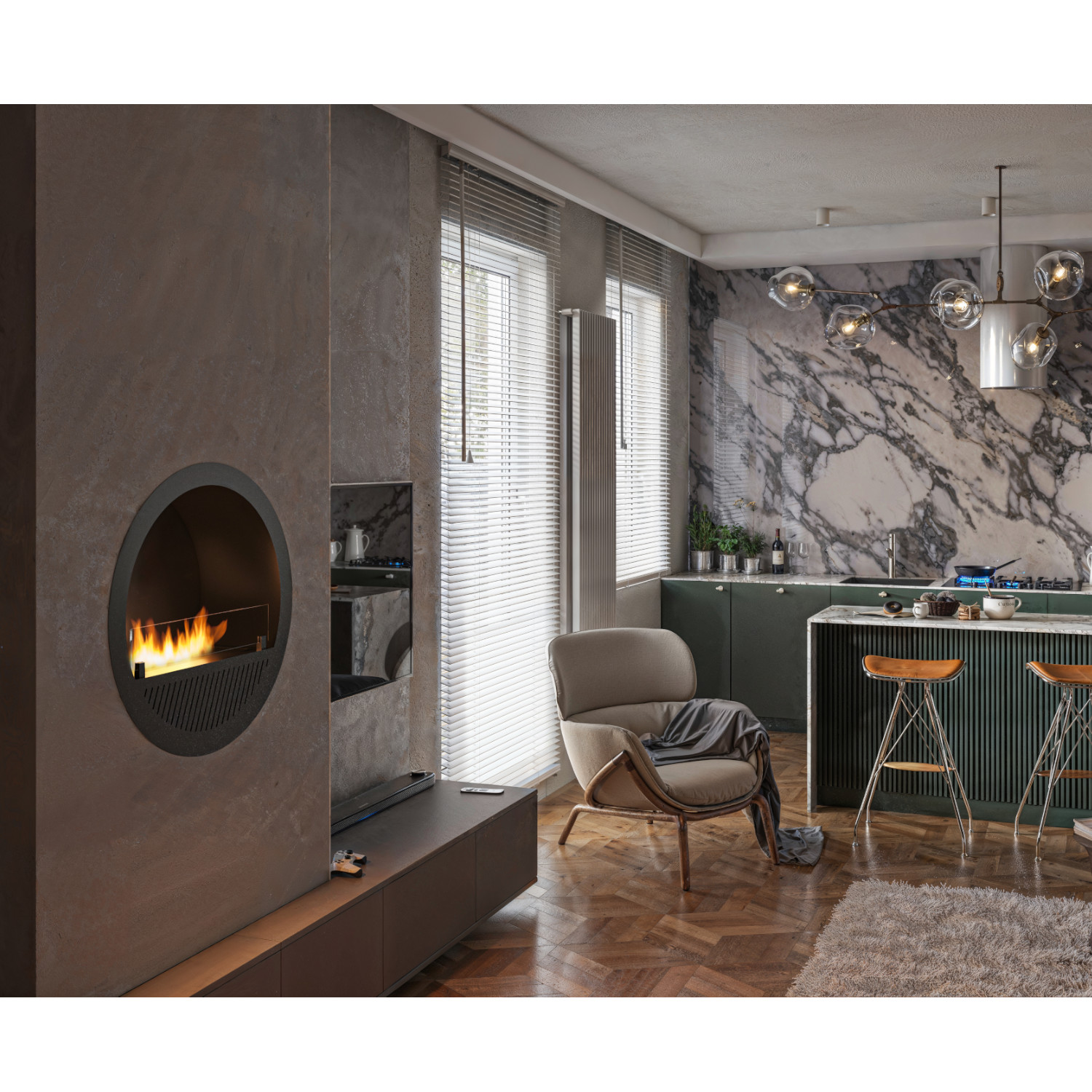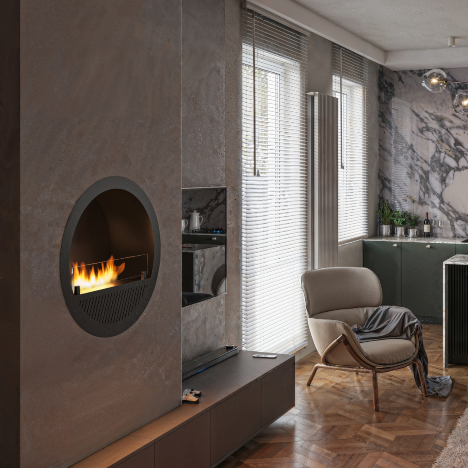 Der Kamin wird direkt in die Wand oder eine vorbereitete Nische eingesetzt und kann dank seiner einfachen Montage auch nachträglich integriert werden. Bitte beachten Sie, dass der Einbau ausschließlich mit feuerfestem Plattenmaterial erfolgen sollte, da der Kamin Wärme an die Umgebung abgibt. In der Rückwand befinden sich Montagelöcher zur sicheren Befestigung. Der Kamin ist für den Einbau in eine runde Aussparung mit einem Durchmesser von ca. Ø690 mm und einer Tiefe von 300 mm vorgesehen.