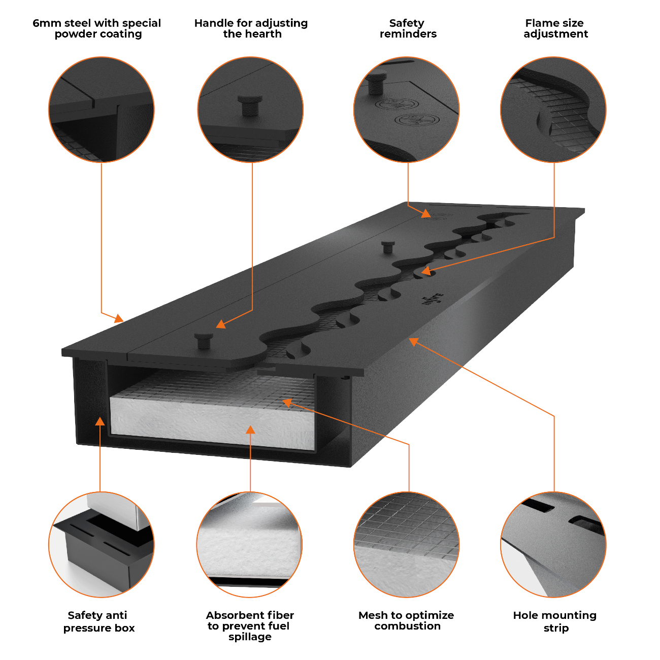 Die Slim Fire-Serie zeichnet sich durch eine elegante, schwarze Optik aus. Schwarze Rahmen und wellenförmige Brenner, geschützt durch starkes, gehärtetes Optiwhite-Glas, sorgen für eine stabile und stilvolle Konstruktion. Das minimalistische Design fügt sich harmonisch in jedes Interieur ein und wird zum perfekten Highlight Ihres Wohnraums.