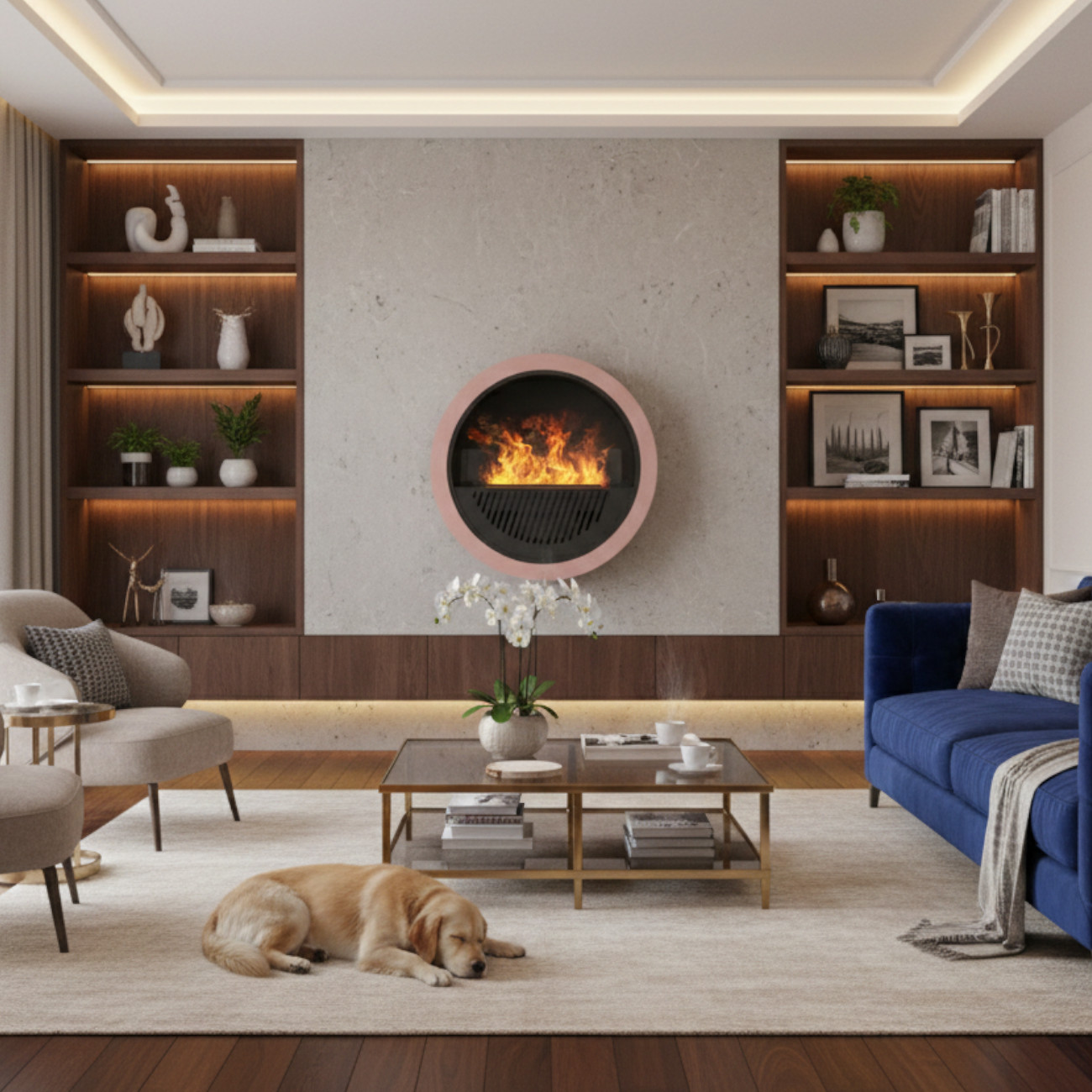 Mit seinem markanten Durchmesser von 70 cm und der eleganten hellrosa Oberfläche setzt der Kamin einen außergewöhnlichen, designorientierten Akzent im Raum. Die Wandmontage sorgt für eine platzsparende Integration und eröffnet vielseitige Gestaltungsmöglichkeiten in Wohnräumen, Büros oder gewerblichen Objekten.