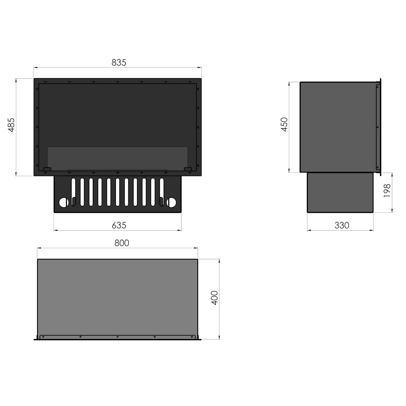 📏 Abmessungen: 835 x 400 x 485mm (+198) + 100 mm (Glas)