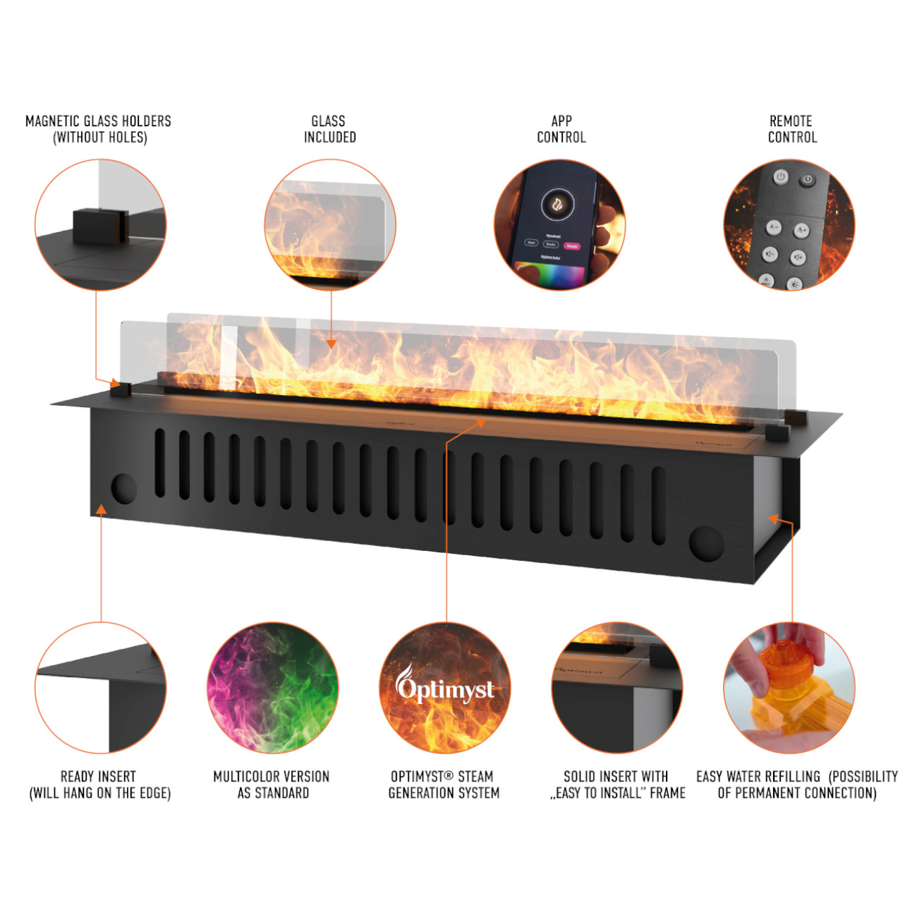 Invapo Insert 1200 Optimyst® – Der realistische Wasserdampf-Kamineinsatz für stilvolle Innenräume Erleben Sie die perfekte Kaminillusion mit dem Invapo Insert 1200 Optimyst®. Durch modernste Optimyst®-Technologie kombiniert dieser Kamineinsatz ultrafeinen Wasserdampf mit LED-Backlighting, um täuschend echte Flammeneffekte zu erzeugen – ganz ohne Feuer, Rauch oder Emissionen. Die optional anpassbare Multicolor-LED-Beleuchtung sorgt für ein einzigartiges Ambiente, während die gekrümmten Antisol-Glaspaneele das Flammenbild stilvoll einrahmen. Der Invapo Insert 1200 Optimyst® eignet sich hervorragend für DIY Kaminprojekte, moderne Cinewalls, stilvolle Wohnwände oder als dekorativer Kamin unter dem Fernseher in TV-Wänden. Durch den besonders realistischen Optimyst® Wasserdampf-Flammeneffekt entsteht eine täuschend echte Kaminatmosphäre – ganz ohne echte Flamme. Damit ist dieser Elektrokamin Einsatz die perfekte Lösung für alle, die einen Kamin ohne Schornstein realisieren möchten. Da kein echtes Feuer entsteht, besteht keine Brandgefahr und der Kamin kann sicher in Wohnräumen, Apartments oder modernen Designprojekten integriert werden. Hauptmerkmale & Vorteile Realistische Flammenillusion – Wasserdampftechnologie mit Multicolor-LED-Effekt für eine natürliche KaminoptikMulticolor-LED-Backlighting – Einstellbare Flammenfarben für individuelle AtmosphäreEingebaute Sound-Simulation – Nachbildung von knisterndem Holzfeuer für ein authentisches ErlebnisBequeme Steuerung – Bedienung per Fernbedienung oder Smartphone-AppSicher & umweltfreundlich – Kein echtes Feuer, keine Emissionen – ideal für InnenräumeFlexible Wasserzufuhr – Manueller 2,4-Liter-Wassertank oder optionaler Anschluss an die WasserleitungEnergieeffizient – Flammeneffekt verbraucht nur 470 WGlaspaneele mit Magnetbefestigung – Einfache Installation und elegantes Design Technische Details Abmessungen: 1200 x 400 x 202 + 120 mm (Glas) Gewicht: 41 kg netto, 55 kg brutto Stromanschluss: 230V/50Hz, Typ C Stecker (Kabellänge: 150 cm) Betriebsdauer: 8-10 Stunden pro Tankfüllung Material: Pulverbeschichteter Stahl, Farbe: Schwarz (alternative RAL-Farben optional) Lieferumfang Invapo Insert 1200 Optimyst® Kamineinsatz 1x Cassette 1000 Retail Multi mit Multicolor-Flammeneffekt Gekrümmte Antisol-Glaspaneele (4 mm, 2 Stück) Fernbedienung & App-Steuerung Eingebaute Sound-Simulation Netzanschluss (230V, Typ C, 150 cm Kabellänge) Installationshinweise Mindestens 420 cm² Lüftungsfläche erforderlich Flexible Installation dank magnetischer Glasbefestigung Optionaler Wasseranschluss für dauerhaften Betrieb möglich Perfekt für Wohnräume & Apartments – Stilvolle Kaminoptik ohne Schornstein oder Rauch Hotels & Restaurants – Elegante Feuerillusion für eine einladende Atmosphäre Büros & Geschäftsräume – Modernes Design-Element für stilvolle Innenräume Nachhaltige Kaminliebhaber – Emissionsfrei und energieeffizient Setzen Sie auf das Kaminfeuer der Zukunft – sicher, modern und nachhaltig!