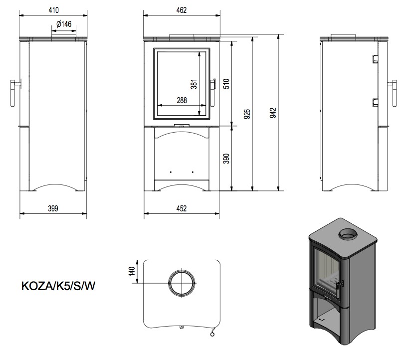 Mit Rauchrohranschluss oben oder hinten lässt sich der Koza K5/S/W flexibel an jede Raumsituation anpassen – egal ob Wohnzimmer, Wintergarten oder Ferienhaus.