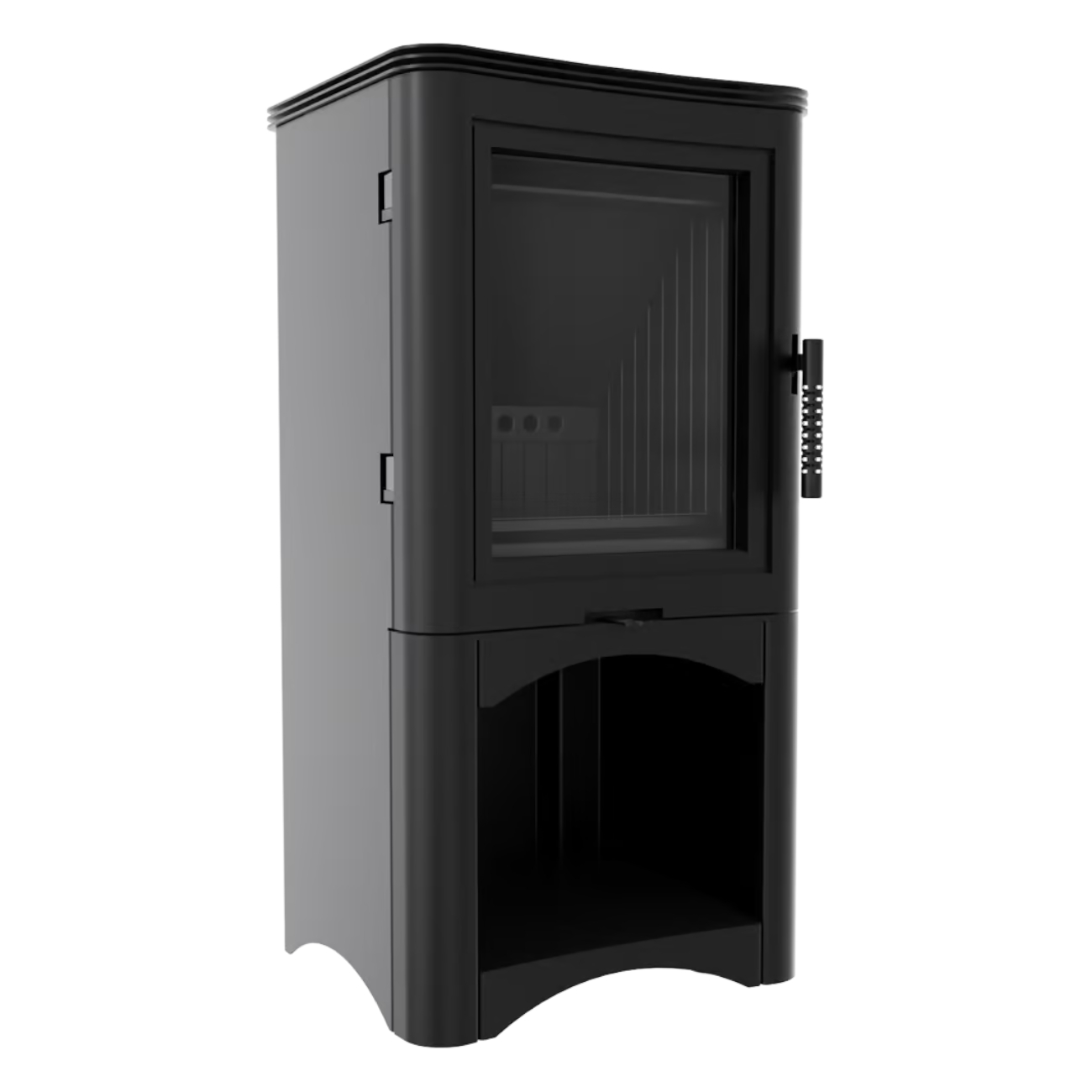 Der Koza K5/S/W Kaminofen kombiniert kraftvolle Heizleistung mit einem eleganten, zeitlosen Design. Mit 7 kW Nennwärmeleistung eignet er sich ideal für mittelgroße Räume und schafft eine stilvolle Wohlfühlatmosphäre. Das offene Holzfach unterhalb der Brennkammer bietet praktische Holzlagerung und rundet das Erscheinungsbild harmonisch ab.