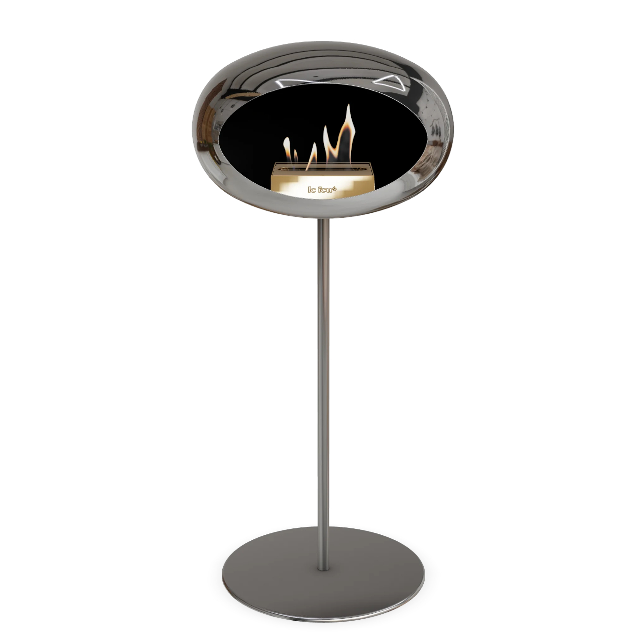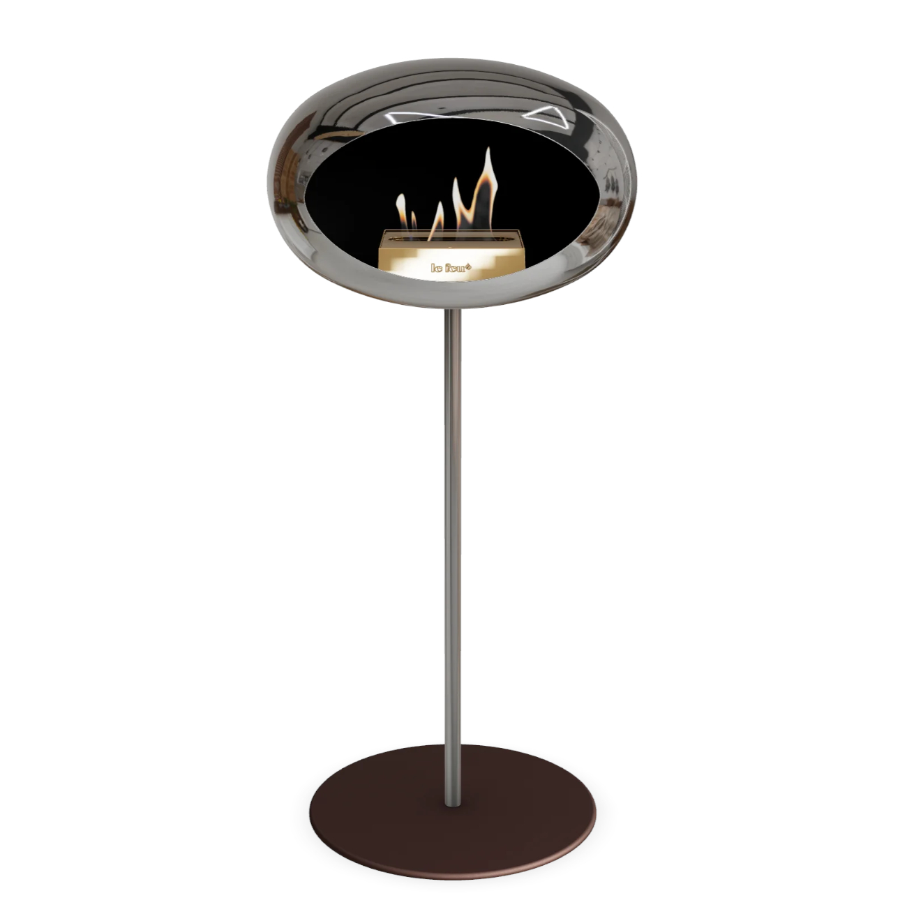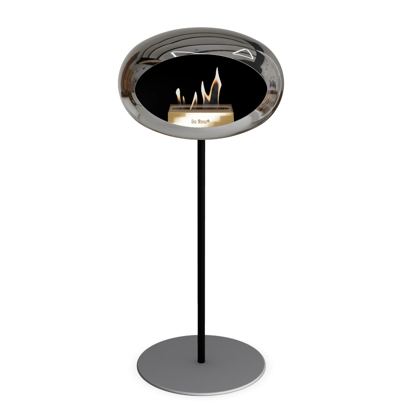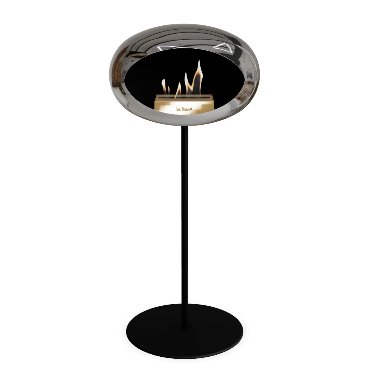 Die stabile 80 cm hohe Stange und die massive Bodenplatte (Ø 45 cm) sorgen für sicheren Stand und verleihen dem Kamin gleichzeitig eine optische Leichtigkeit. Die silberverchromte Kuppel reflektiert das Flammenlicht eindrucksvoll und setzt moderne Designakzente. Alle Komponenten sind in verschiedenen Ausführungen erhältlich und passen sich harmonisch Ihrem Interieur an.