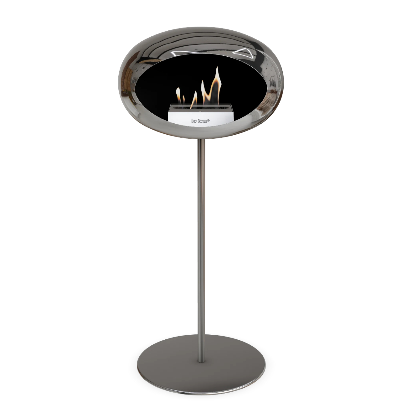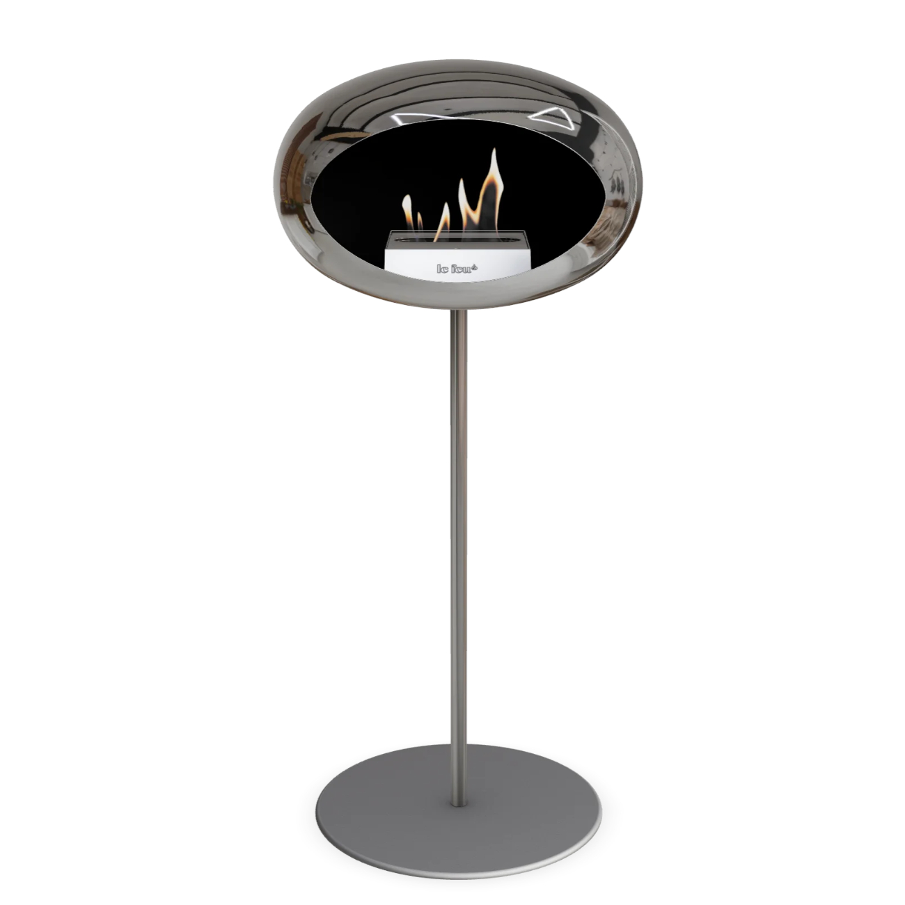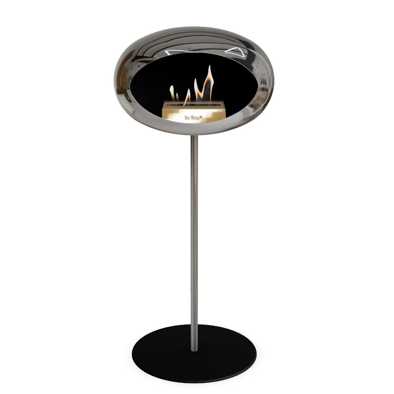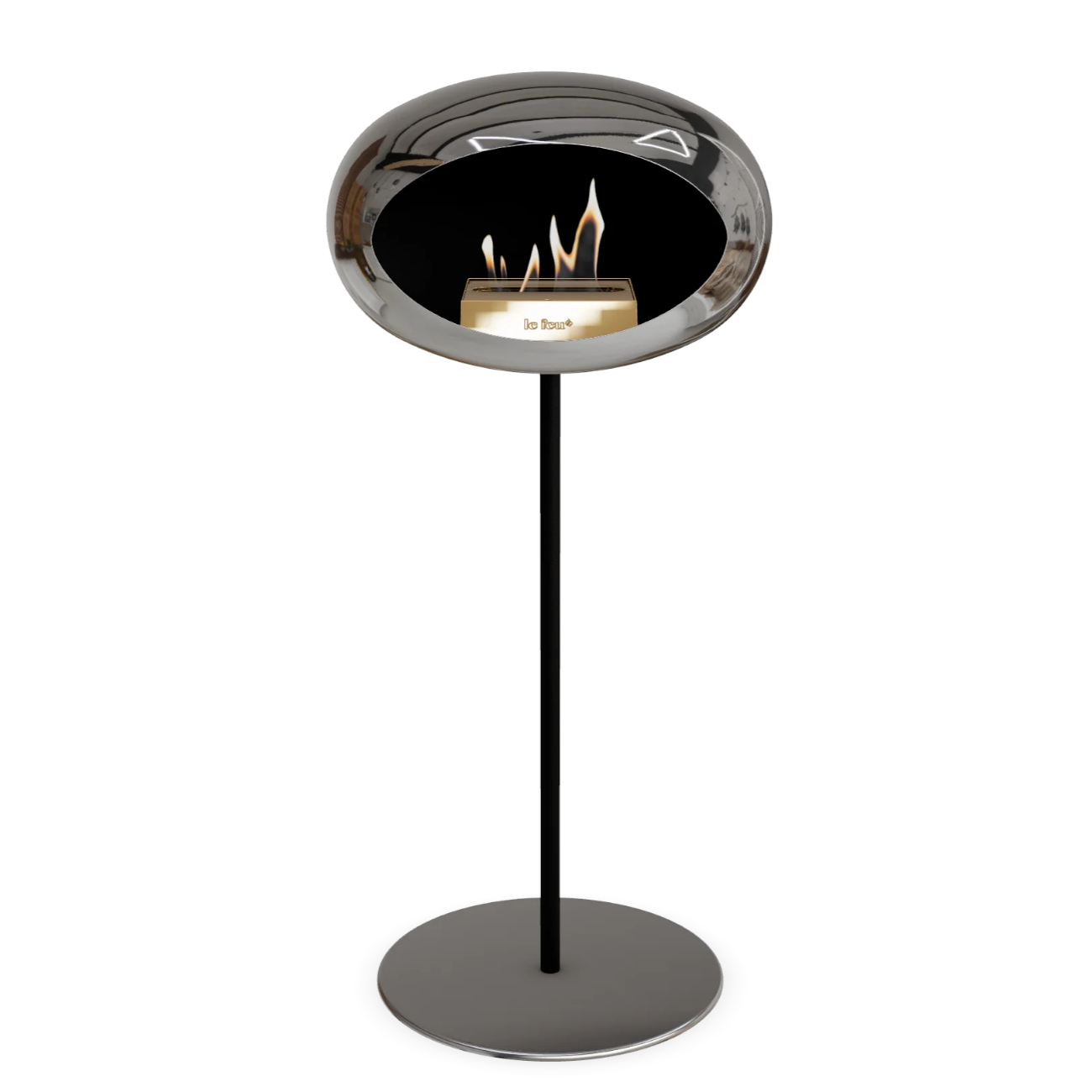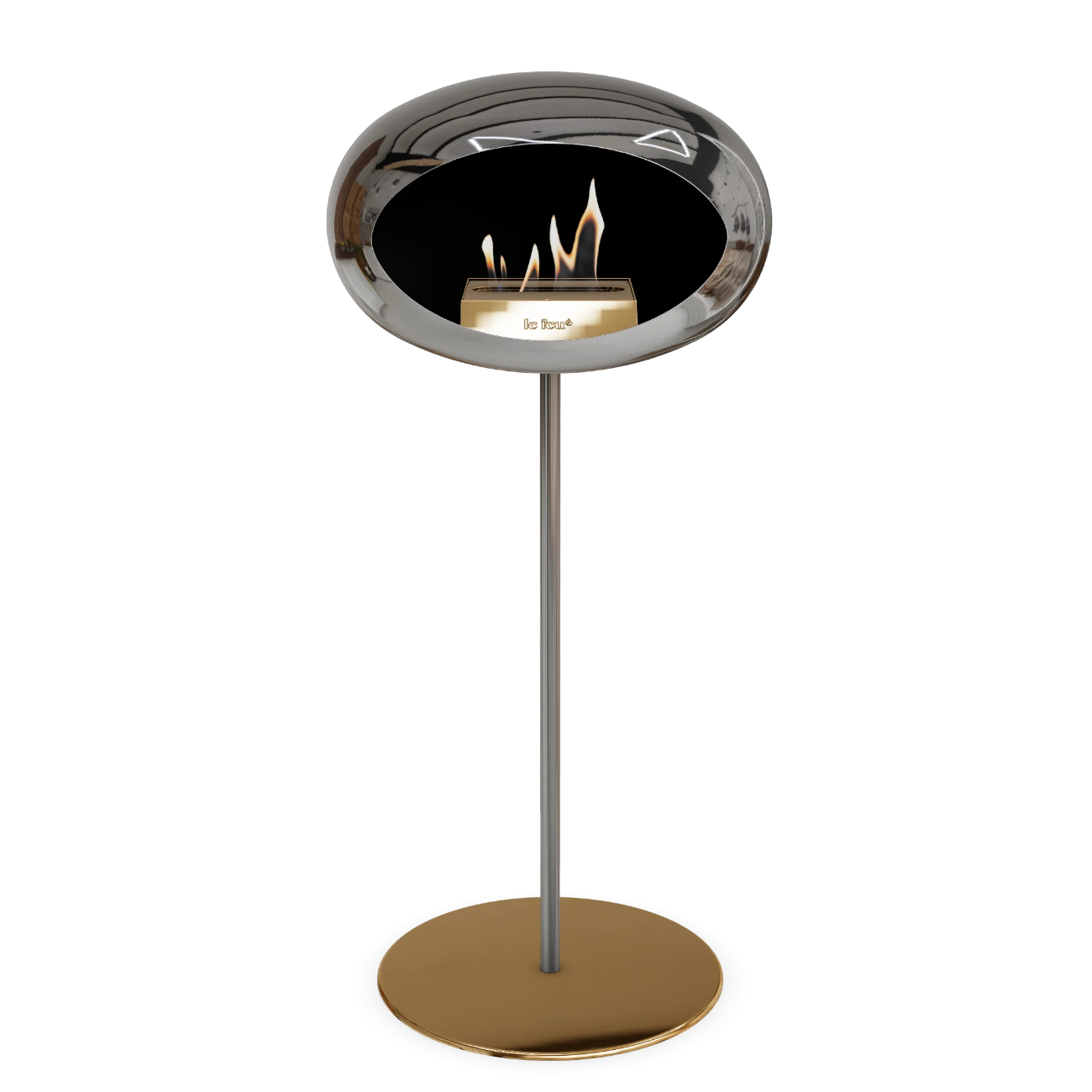 Die stabile 80 cm hohe Stange und die massive Bodenplatte (Ø 45 cm) sorgen für sicheren Stand und verleihen dem Kamin gleichzeitig eine optische Leichtigkeit. Die silberverchromte Kuppel reflektiert das Flammenlicht eindrucksvoll und setzt moderne Designakzente. Alle Komponenten sind in verschiedenen Ausführungen erhältlich und passen sich harmonisch Ihrem Interieur an.