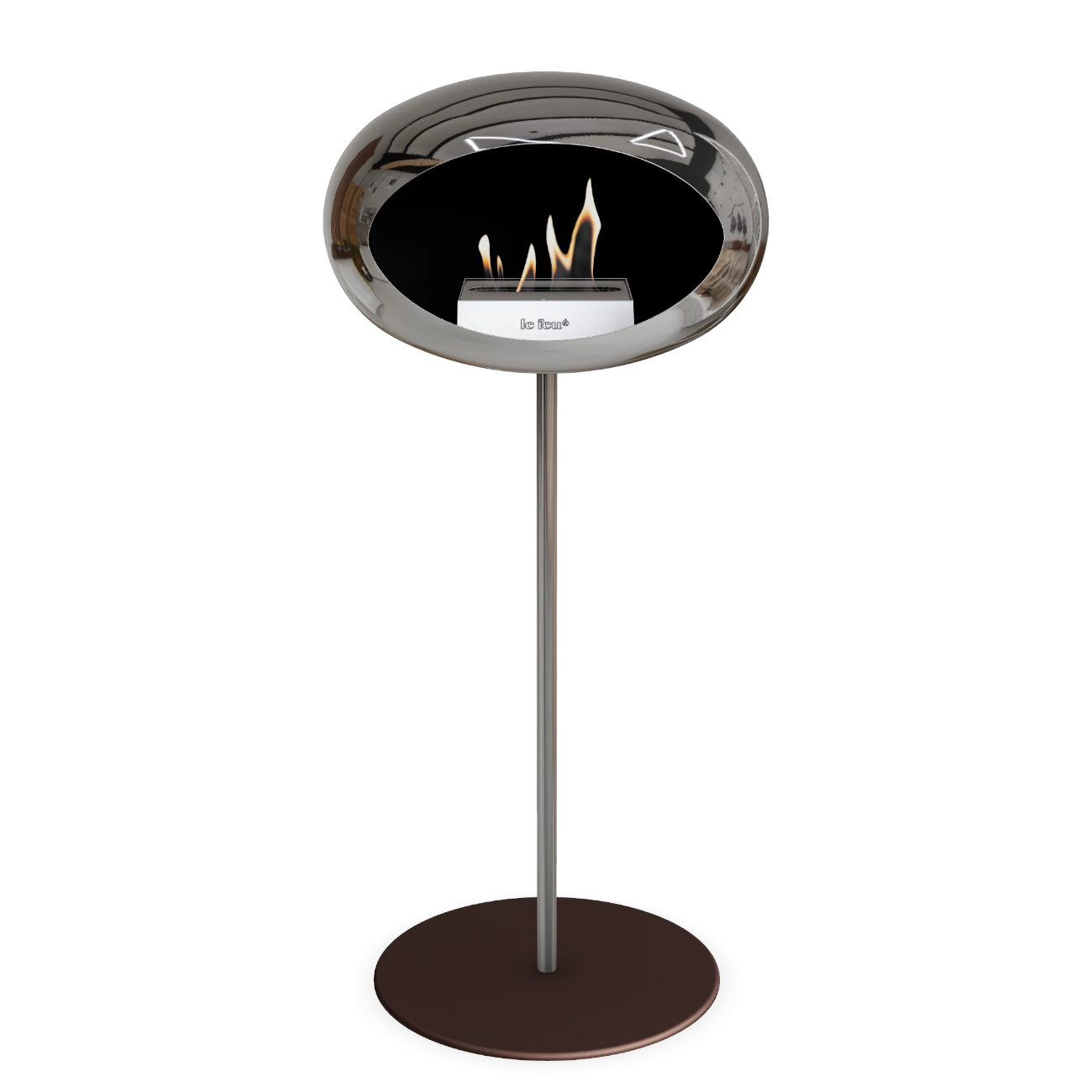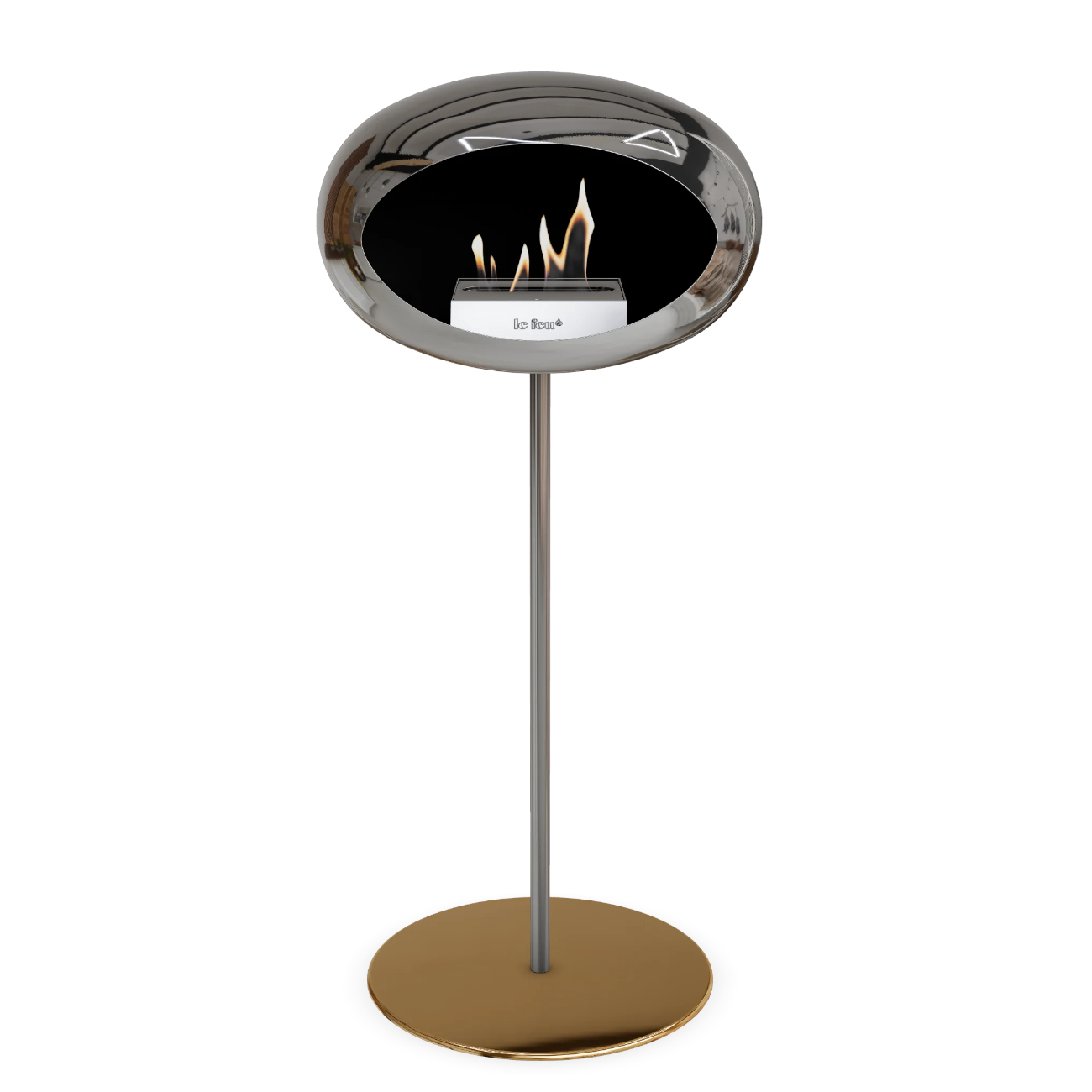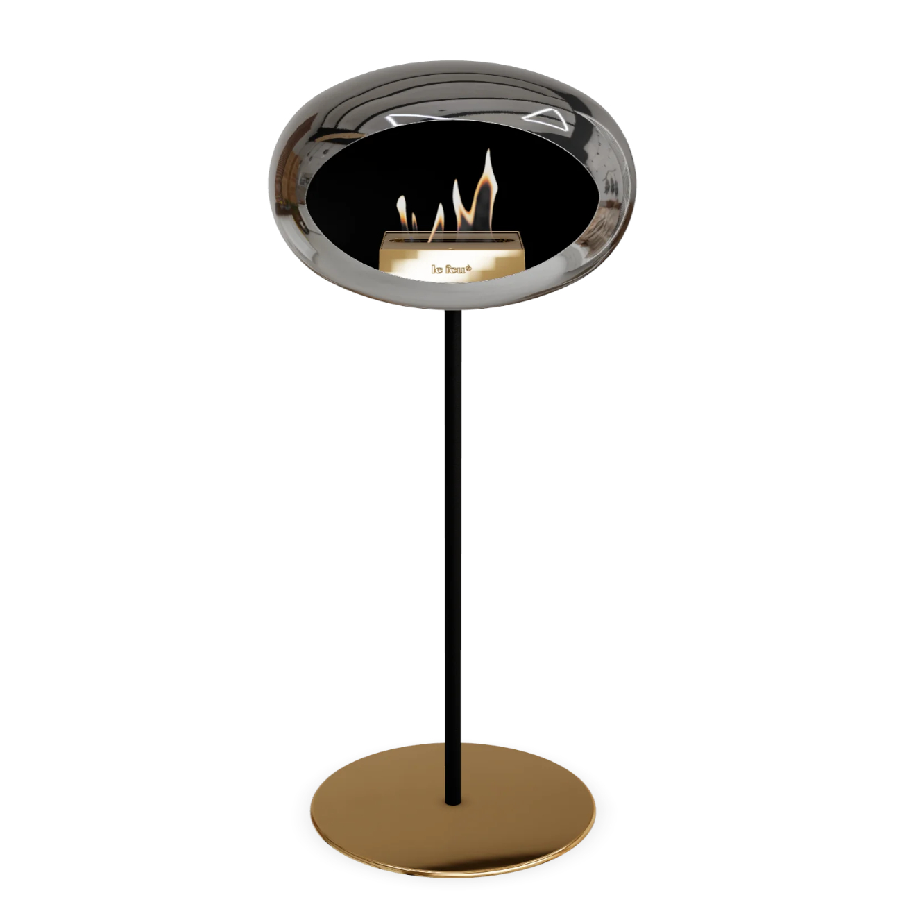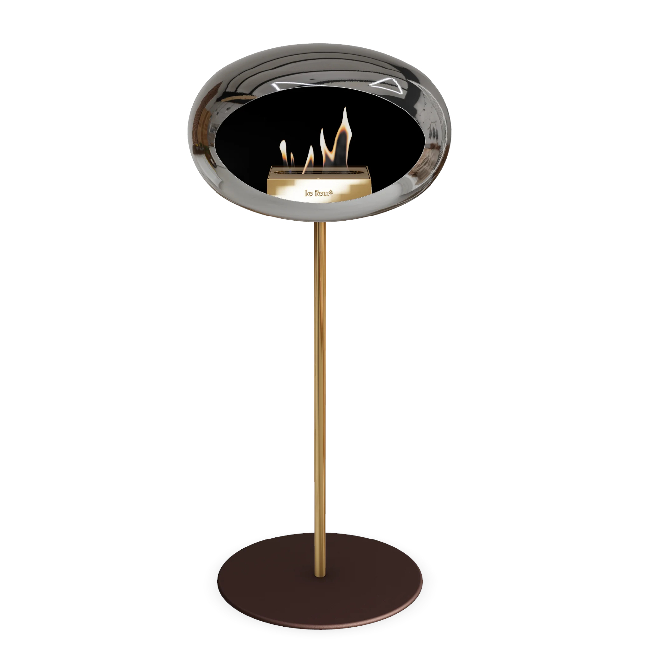 Die stabile 80 cm hohe Stange und die massive Bodenplatte (Ø 45 cm) sorgen für sicheren Stand und verleihen dem Kamin gleichzeitig eine optische Leichtigkeit. Die silberverchromte Kuppel reflektiert das Flammenlicht eindrucksvoll und setzt moderne Designakzente. Alle Komponenten sind in verschiedenen Ausführungen erhältlich und passen sich harmonisch Ihrem Interieur an.