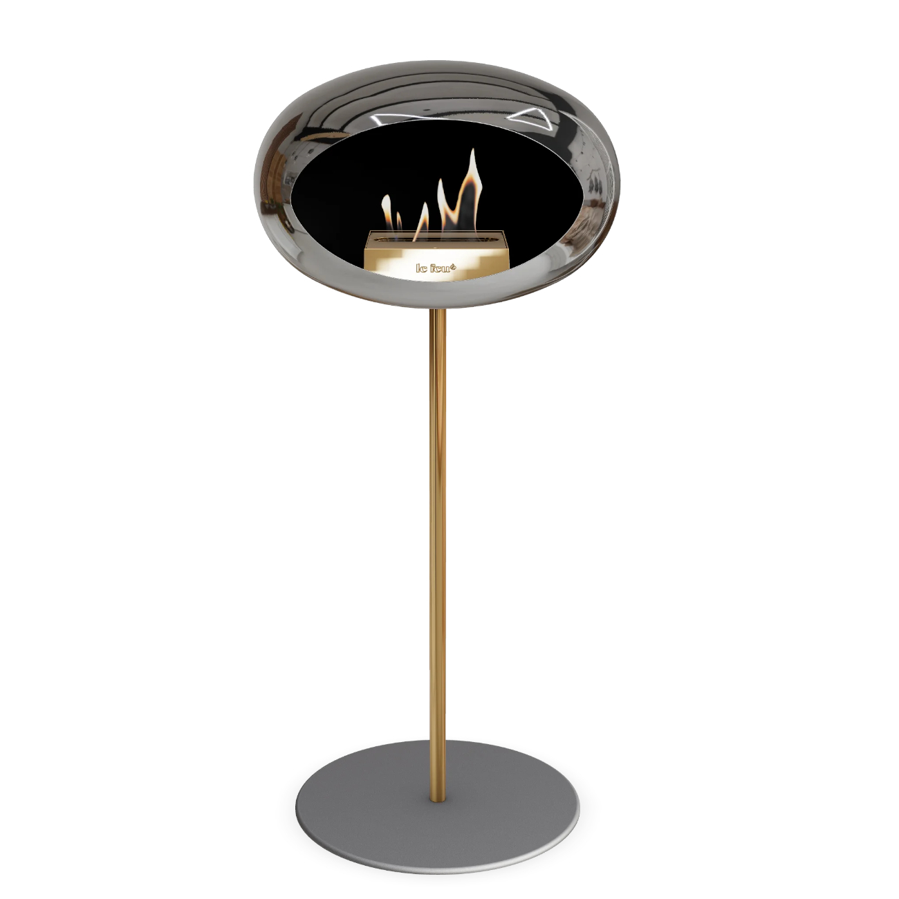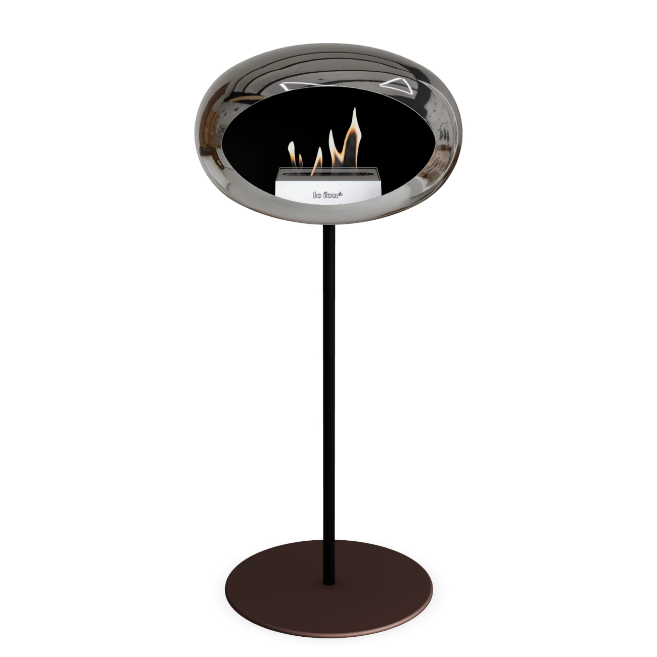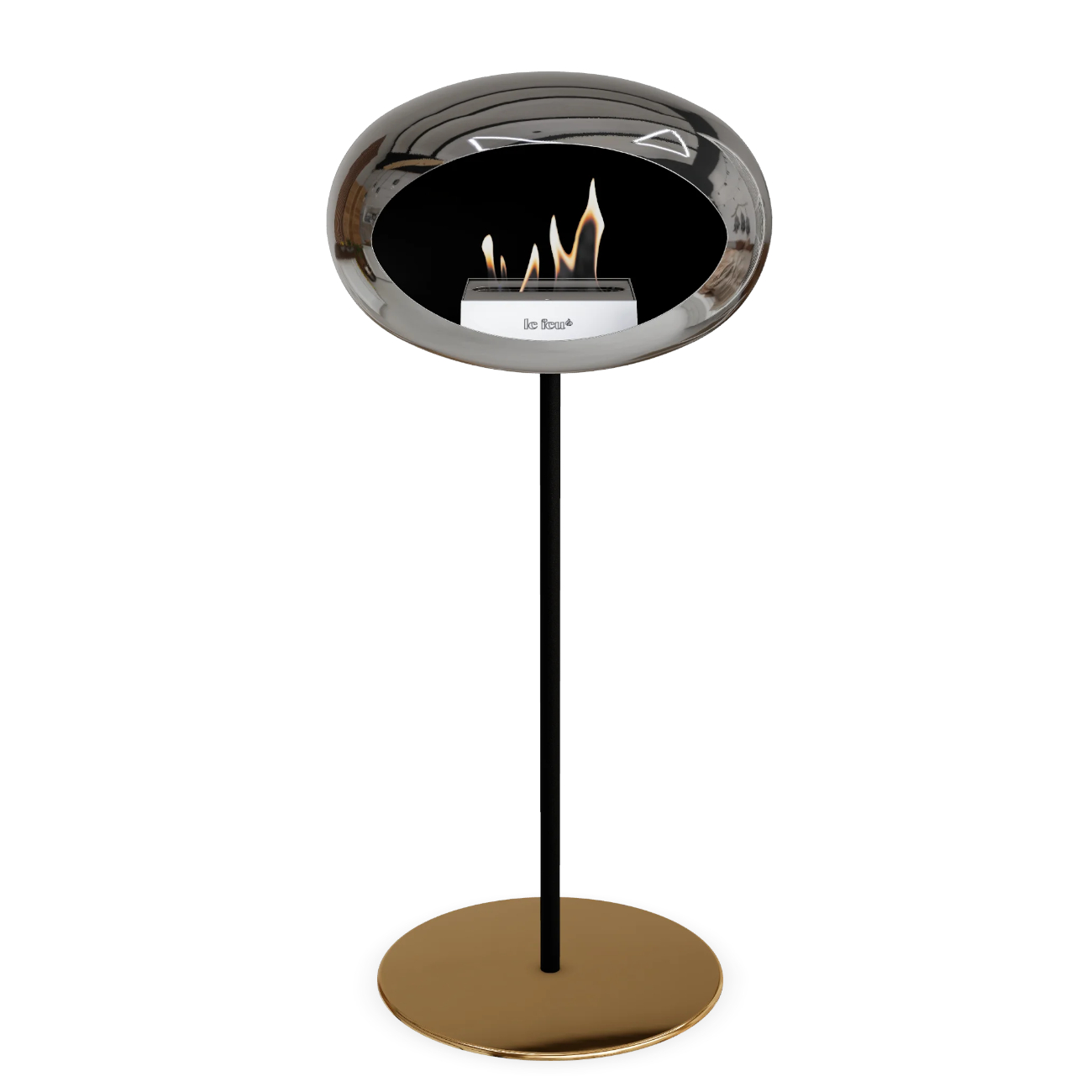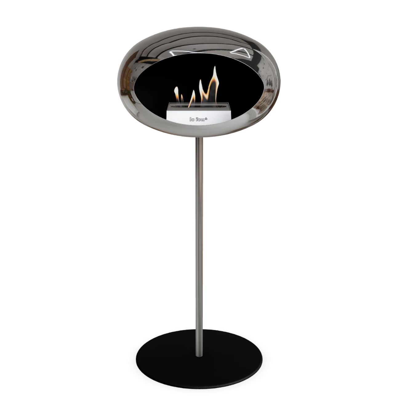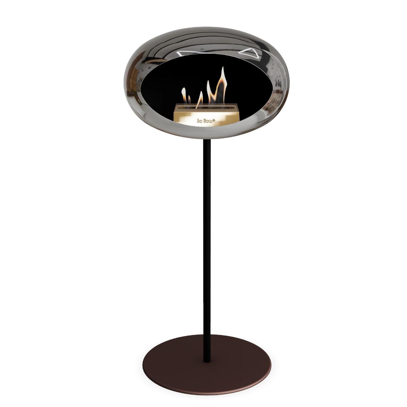 Die stabile 80 cm hohe Stange und die massive Bodenplatte (Ø 45 cm) sorgen für sicheren Stand und verleihen dem Kamin gleichzeitig eine optische Leichtigkeit. Die silberverchromte Kuppel reflektiert das Flammenlicht eindrucksvoll und setzt moderne Designakzente. Alle Komponenten sind in verschiedenen Ausführungen erhältlich und passen sich harmonisch Ihrem Interieur an.