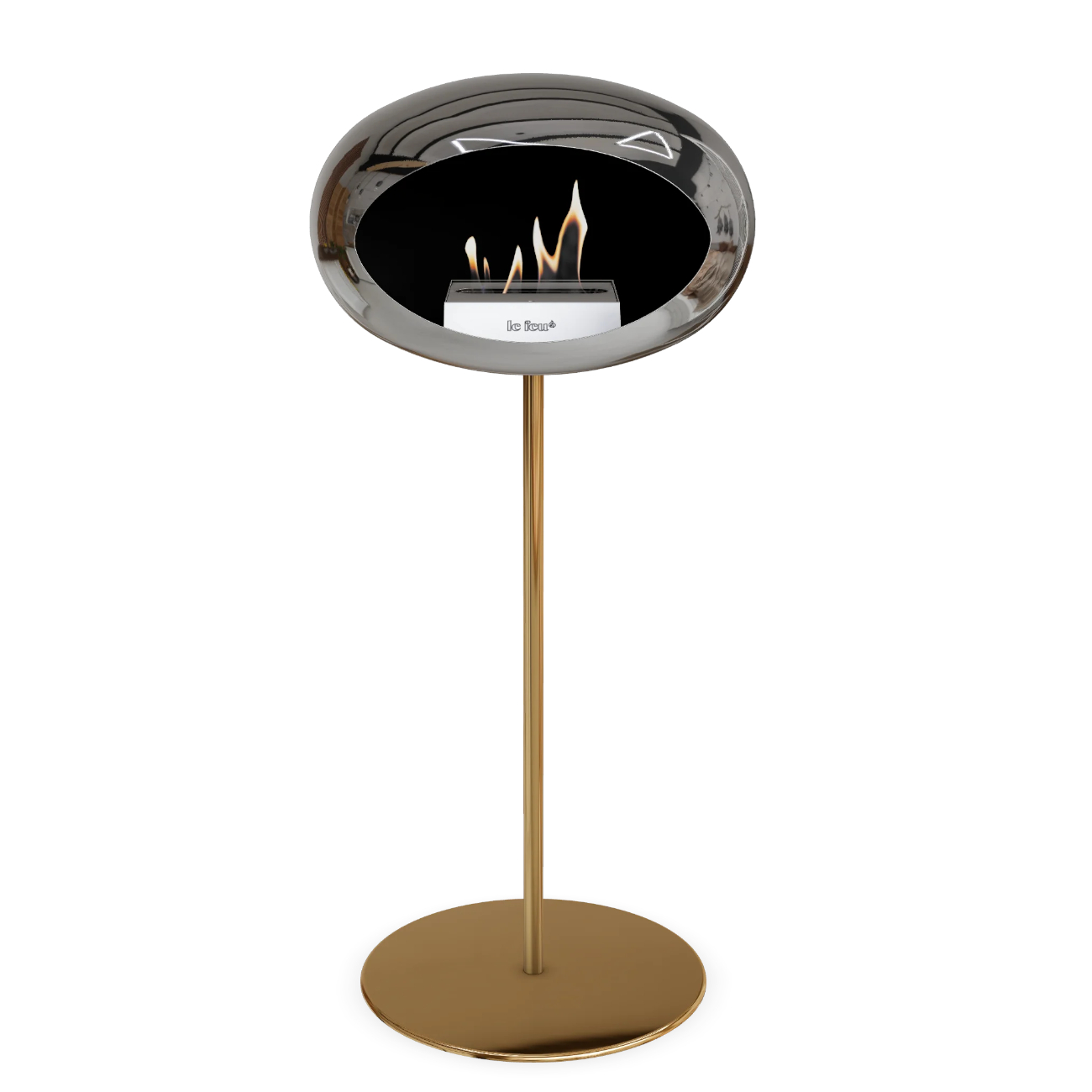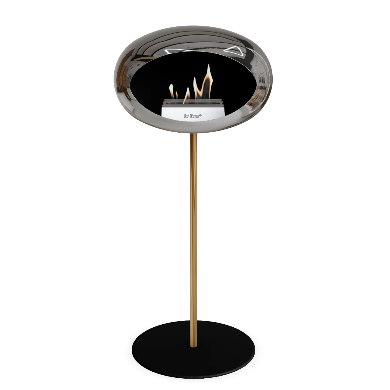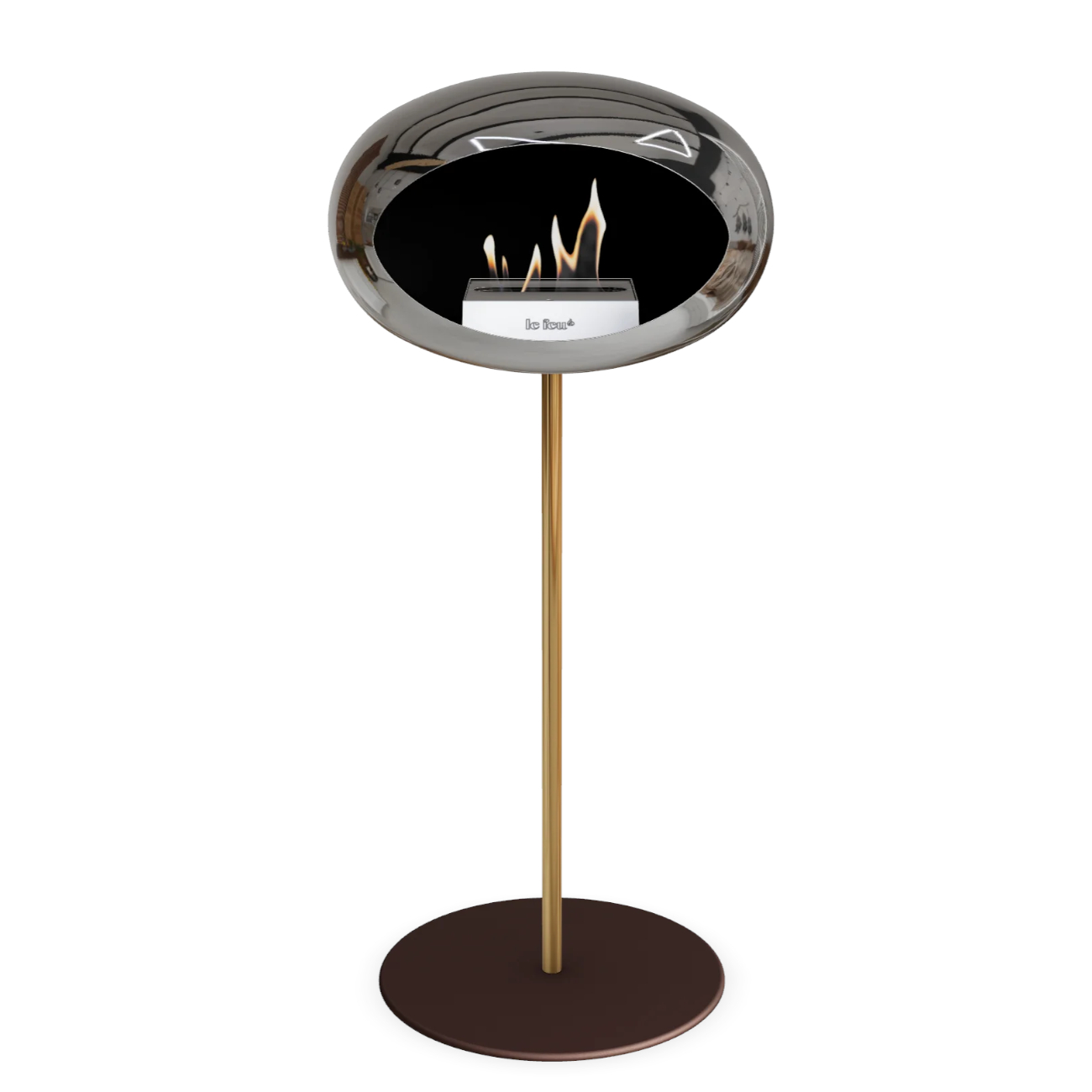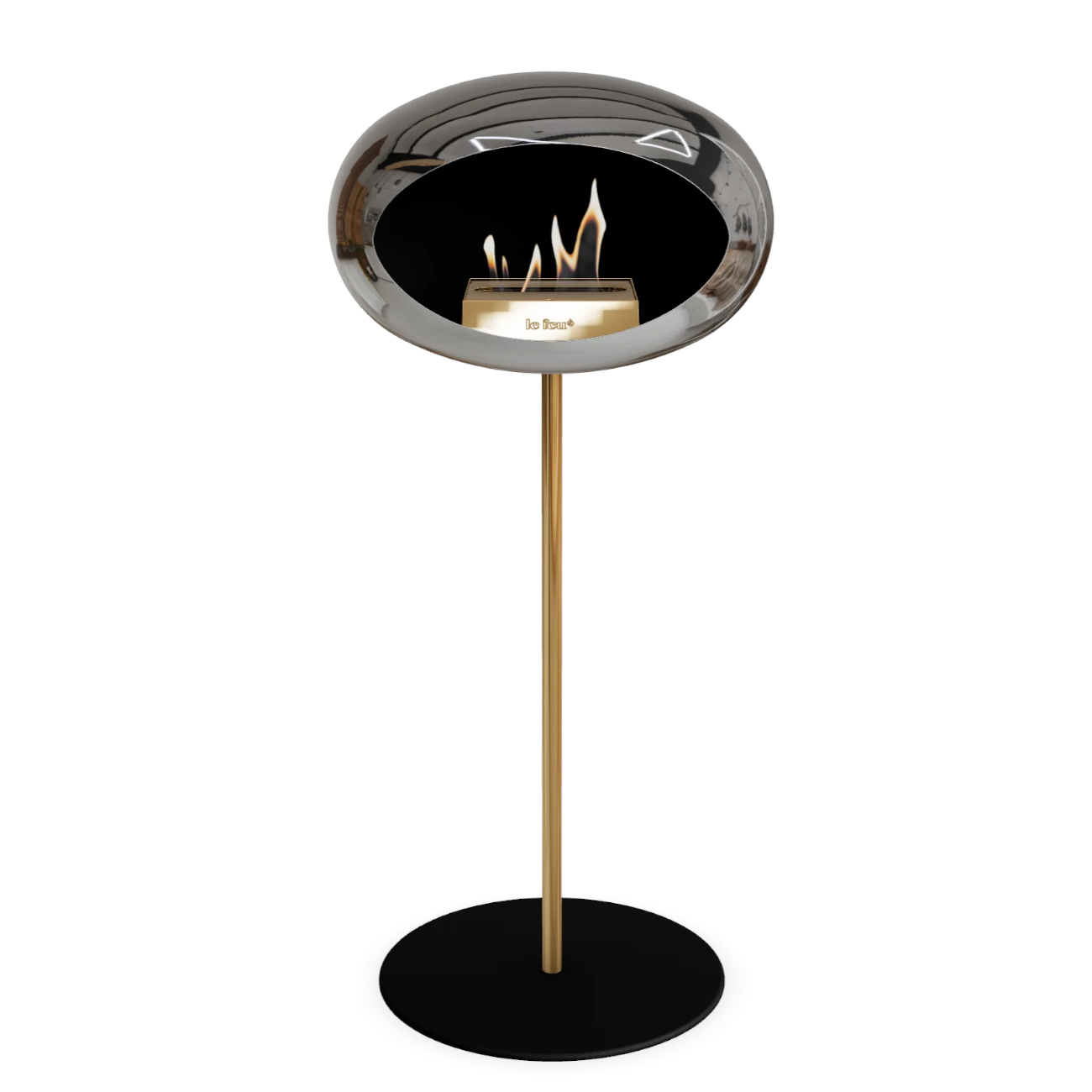 Die stabile 80 cm hohe Stange und die massive Bodenplatte (Ø 45 cm) sorgen für sicheren Stand und verleihen dem Kamin gleichzeitig eine optische Leichtigkeit. Die silberverchromte Kuppel reflektiert das Flammenlicht eindrucksvoll und setzt moderne Designakzente. Alle Komponenten sind in verschiedenen Ausführungen erhältlich und passen sich harmonisch Ihrem Interieur an.