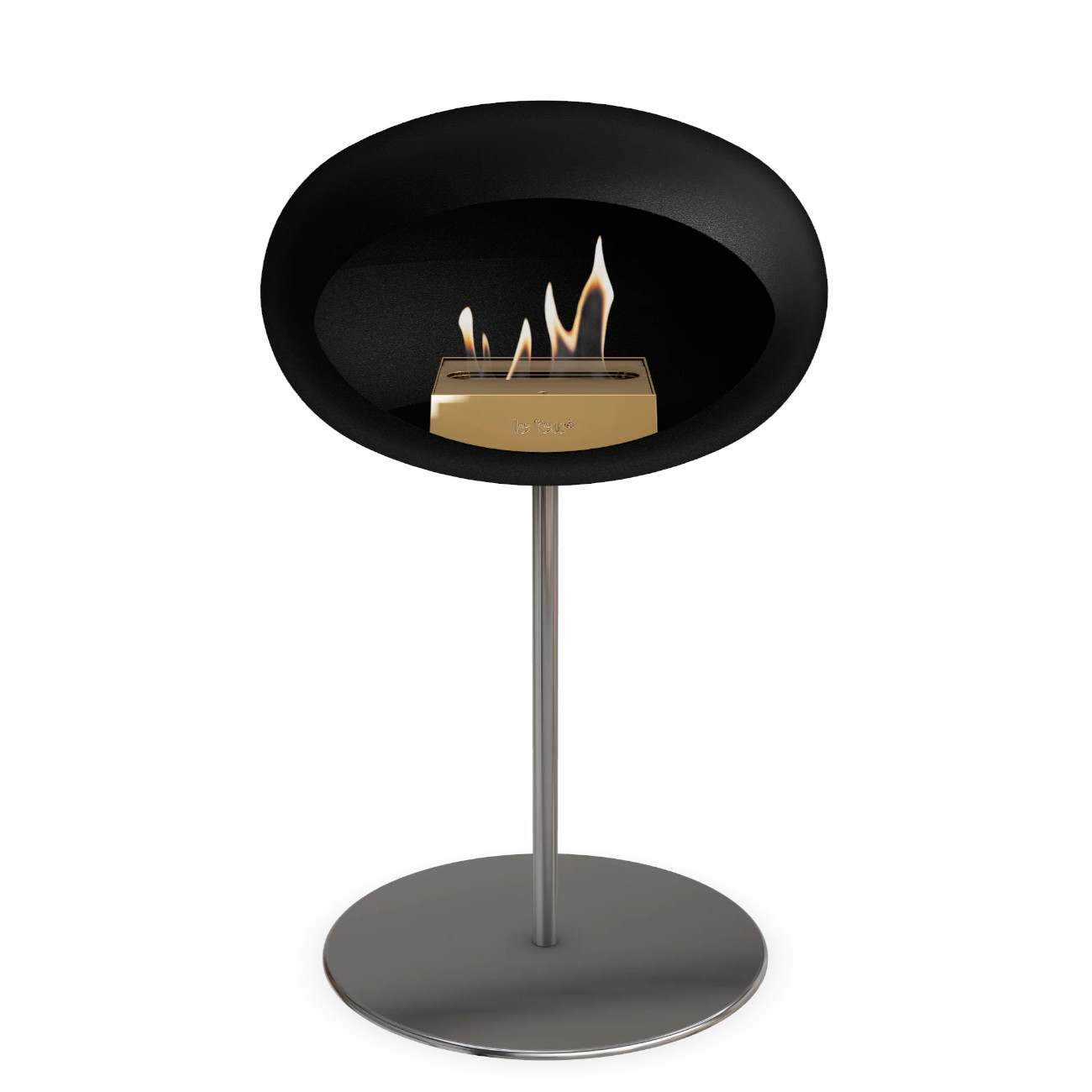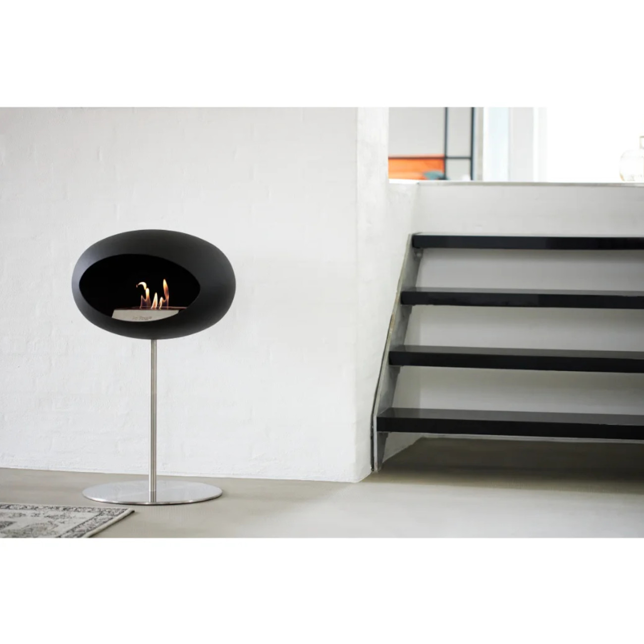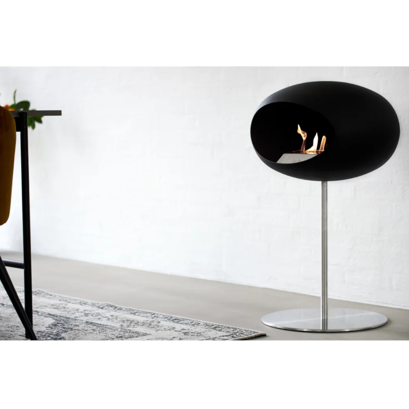 Die Kombination aus matter schwarzer Kuppel, schlanker 50 cm hoher Stange und stabiler Bodenplatte verleiht dem Kamin eine zeitlose, moderne Ausstrahlung. Der Ground Steel Low kann frei im Raum platziert werden und ist sowohl für den Innenbereich als auch für den geschützten Außenbereich geeignet.