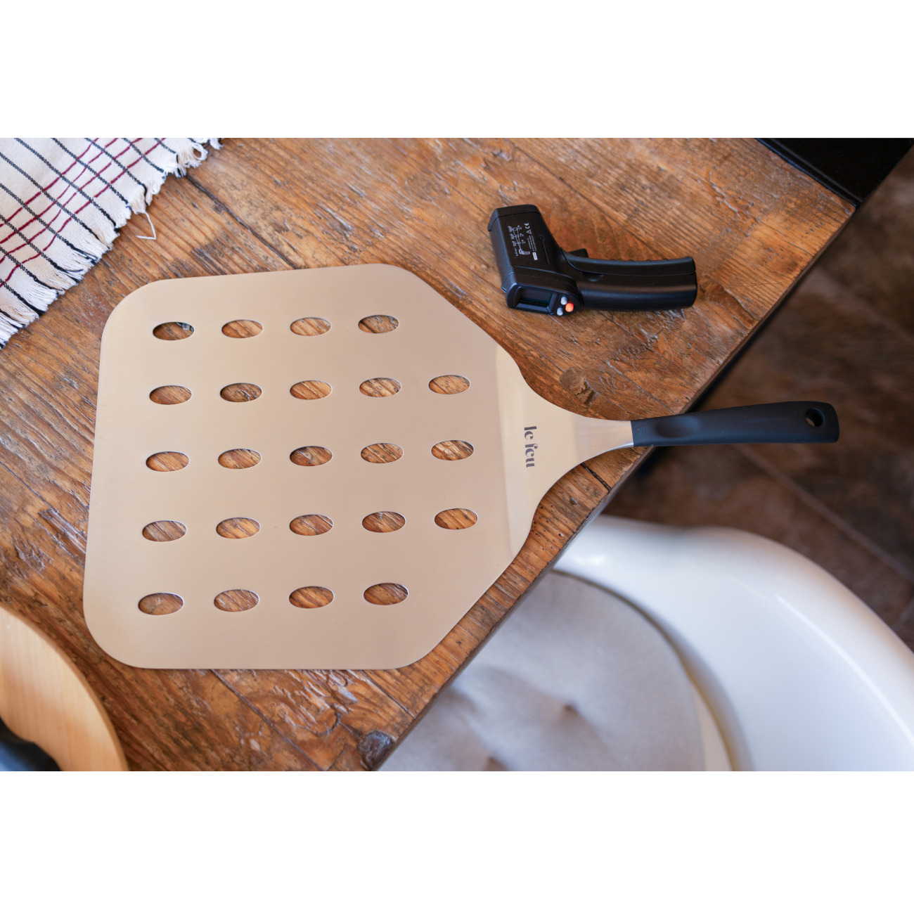 - Die perforierte Pizzaschaufel aus rostfreiem Edelstahl mit gummiertem Griff sorgt für ein sicheres Handling und verhindert überschüssiges Mehl auf dem Pizzastein.
