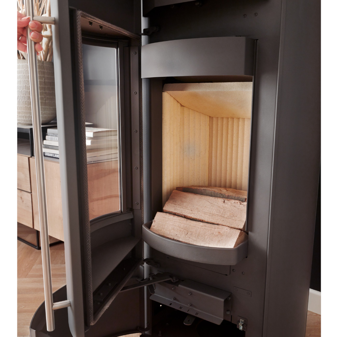 Der belüftete Türgriff ermöglicht ein komfortables und sicheres Nachlegen von Scheitholz. Durch die integrierte Innenbelüftung bleibt der Griff weitestgehend kühl und kann in der Regel ohne Schutzhandschuh angefasst werden – für zusätzlichen Bedienkomfort im Alltag.