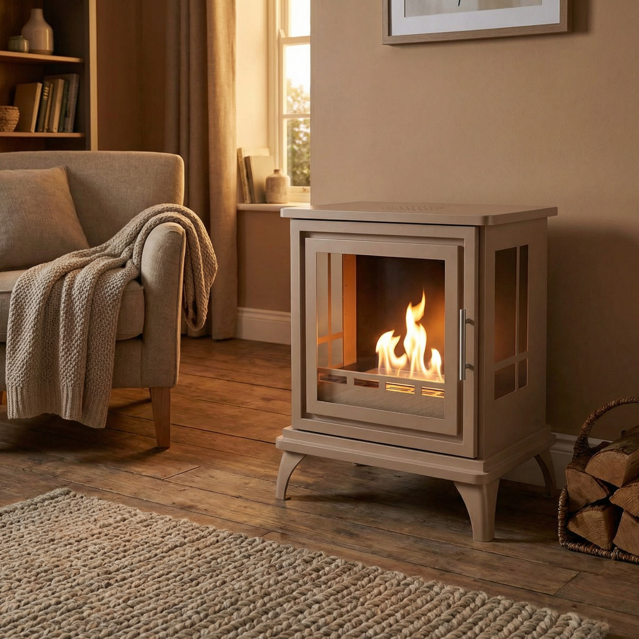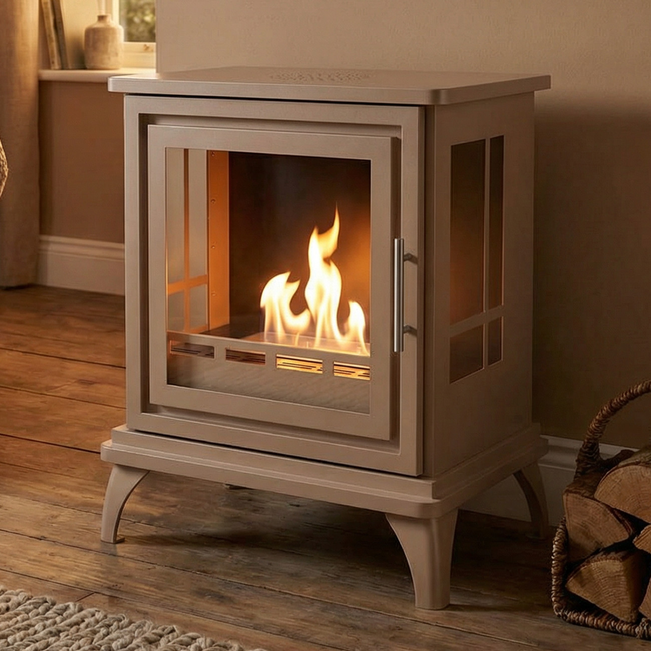 Nashville Graubeige Panorama – freistehender Bioethanol Kaminofen im klassischen englischen Ofendesign