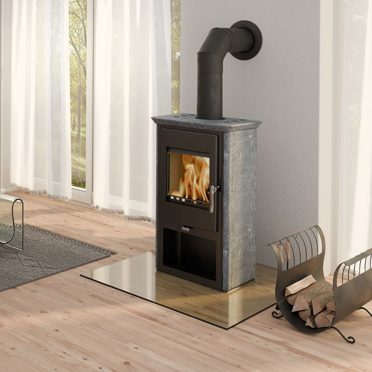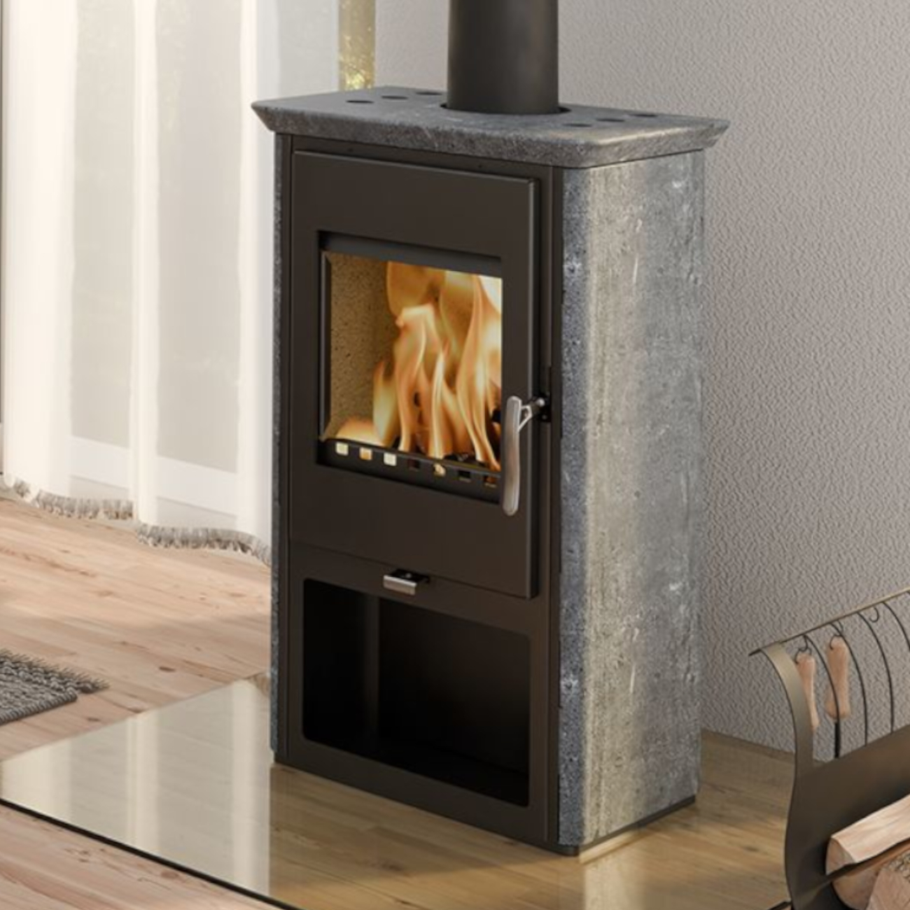 - Holzfach unter dem Kaminofen: Das integrierte Holzfach bietet Ihnen eine praktische Möglichkeit, Brennholz direkt unter dem Kaminofen aufzubewahren – griffbereit und ordentlich.