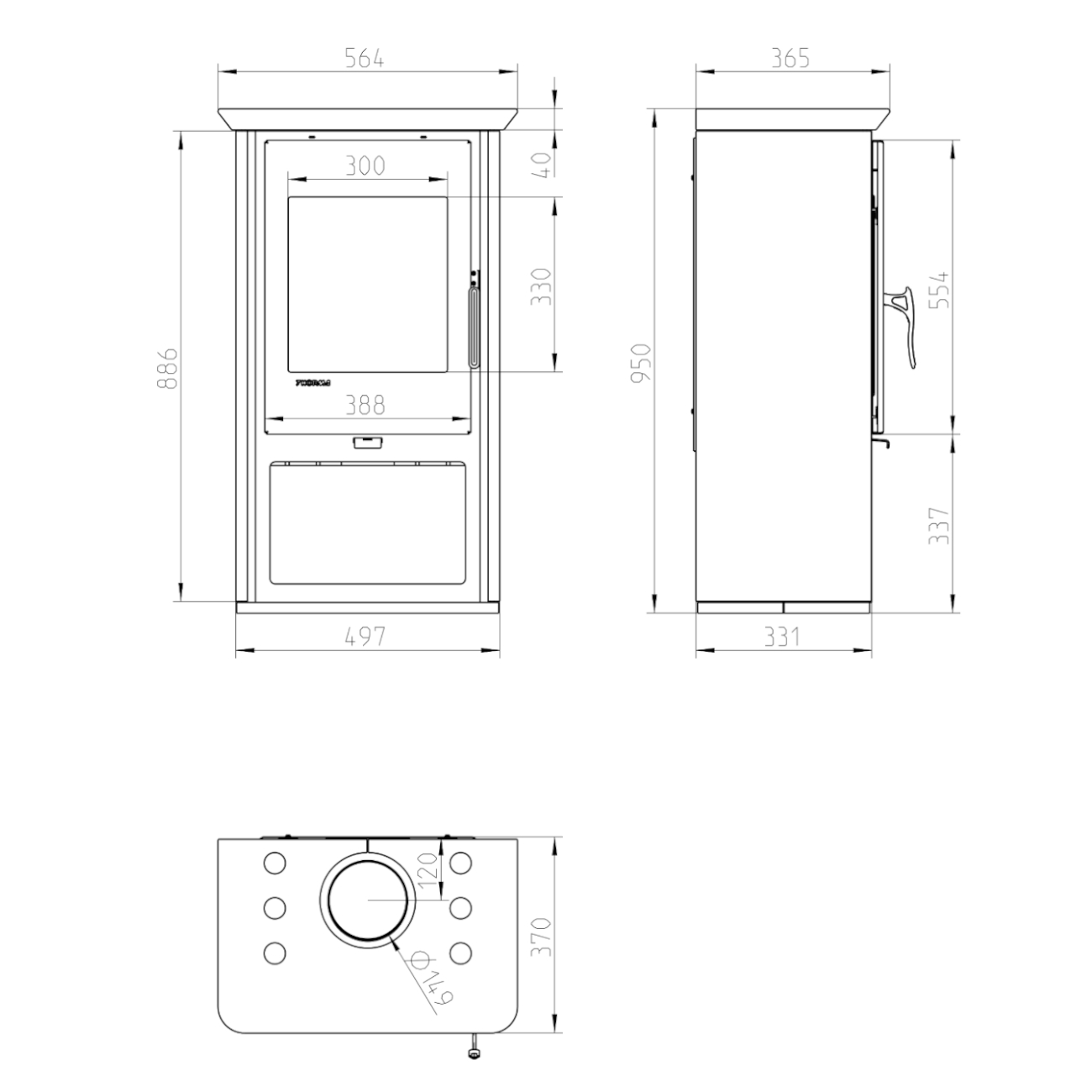 - Abstand von Mitte des Rauchstutzens bis zur Hinterkante des Ofens: 12,0 cm