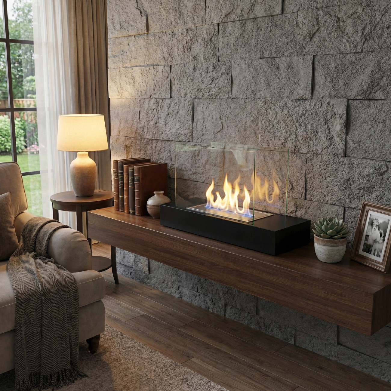 Der Oklahoma Tischkamin benötigt keinen Schornstein und keinen Stromanschluss. Bioethanol verbrennt sauber, ohne Rauch, Ruß oder Asche. Dadurch ist der Kamin besonders pflegeleicht und flexibel einsetzbar – ob im Wohnzimmer, auf der Terrasse oder im Garten.