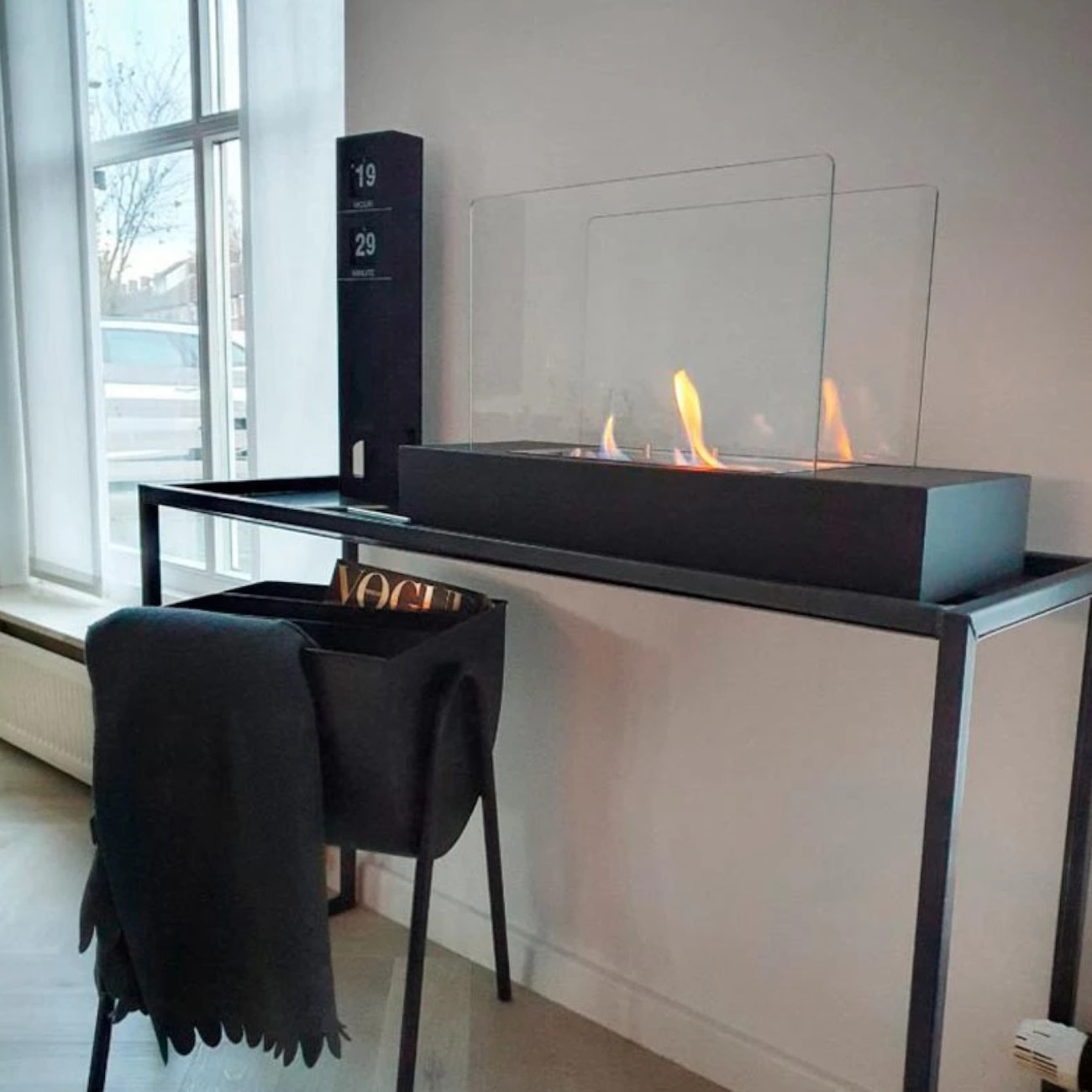 Der schwarze Korpus aus Stahl bildet einen edlen Kontrast zu den lebendigen Flammen. Zwei klare Glasscheiben an Vorder- und Rückseite sorgen für maximale Sichtbarkeit und schützen die Flamme gleichzeitig vor leichter Zugluft. So bleibt das Feuer relativ eingeschlossen, ist jedoch von beiden Seiten gut sichtbar.