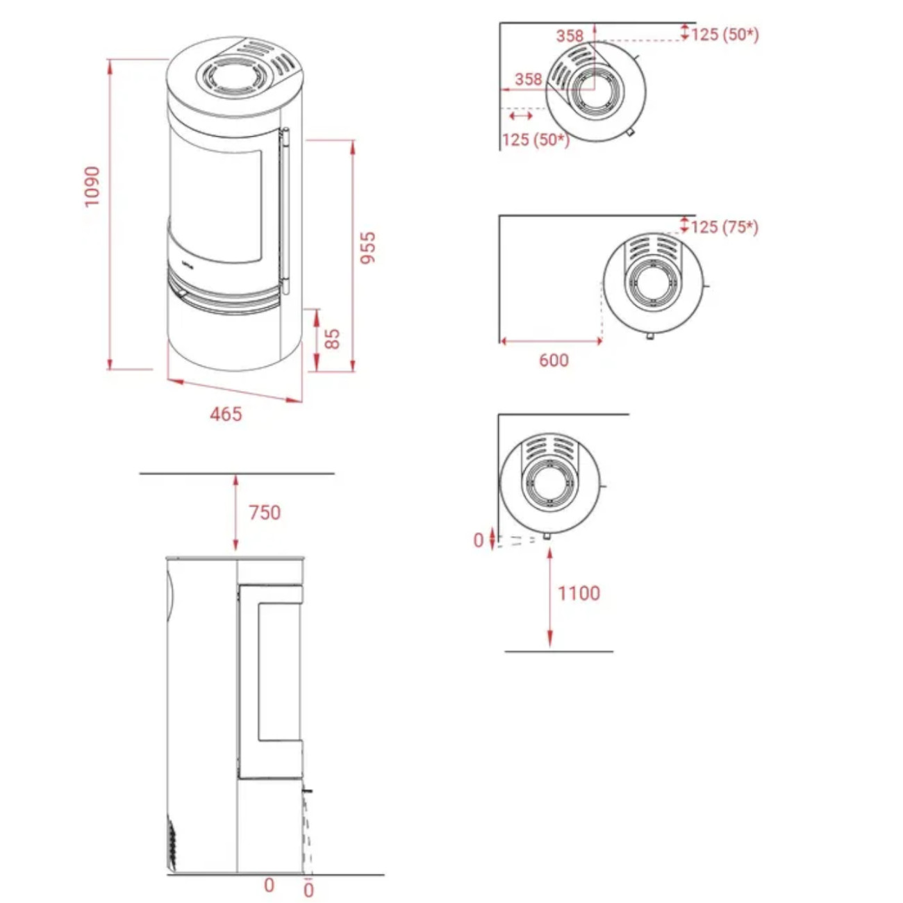 - Raumheizvermögen (abhängig von der Hausisolierung): 30 bis 120 m²