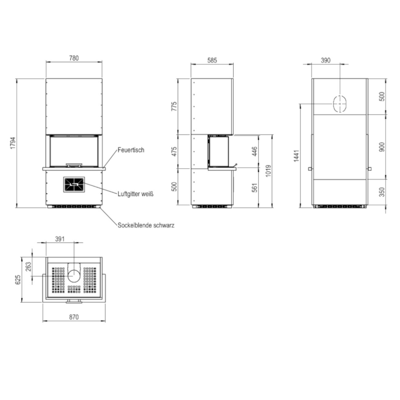 - Hinweis: Bitte sprechen Sie vor dem Kauf mit Ihrem zuständigen Schornsteinfegermeister. Lassen Sie Ihren Schornstein vor dem Einbau der Feuerstelle auf Verwendbarkeit prüfen. Beachten Sie außerdem die Bedienungsanleitungen und die Sicherheitsabstände.