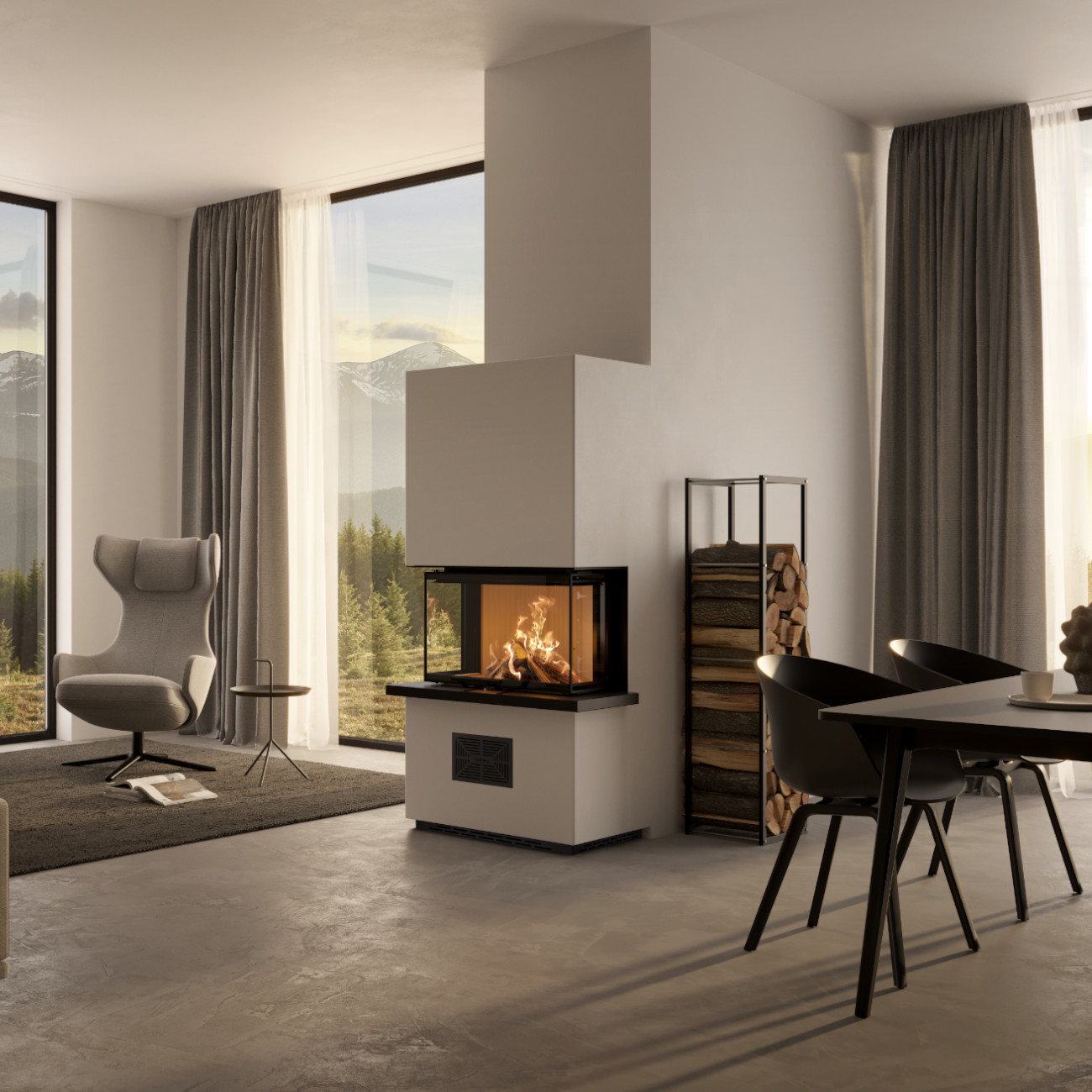Damit durch Ausdehnung keine Spannungen oder Risse in der Verkleidung entstehen, werden die Kaminbauplatten ohne direkte Verbindung zum Grundgerät verbaut. Für den individuellen Look lassen sich die Oberflächen mit verschiedenen Materialien wie Putz, Farbe oder Fliesen gestalten. Auf diese Weise wird der leistungsstarke Bausatzkamin zu einem wahren Blickfang in jedem Wohnraum.