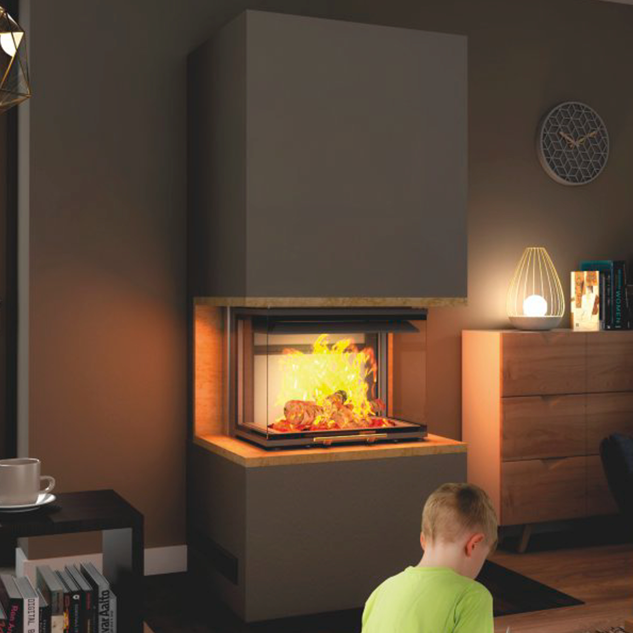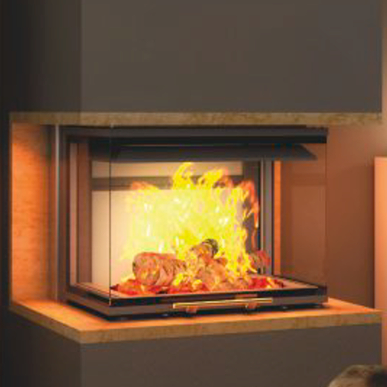 - Modell: Hajduk Smart 3XTH, Warmluft-Eckkamineinsatz, dreiseitige Verglasung, Hebetür