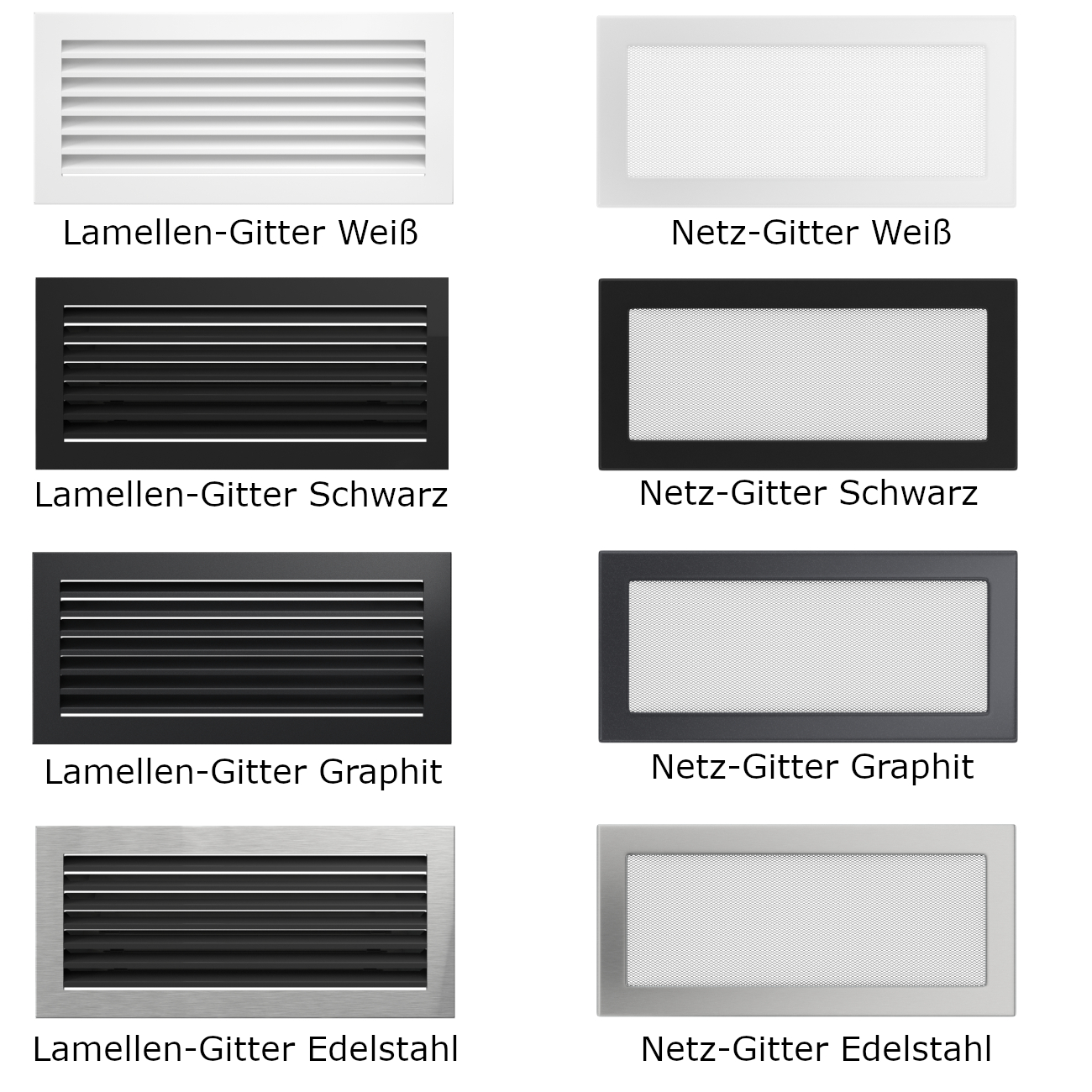 - Warmluftgitter im Sockelbereich: 2 Stück à 17 cm x 37 cm erhältlich in 7 verschiedenen Farbe und 2 Varianten (siehe Bilder) ODER 2 Stück Luftleisten à 60 cm x 9 cm, in 4 verschiedenen Farben (siehe Bilder)