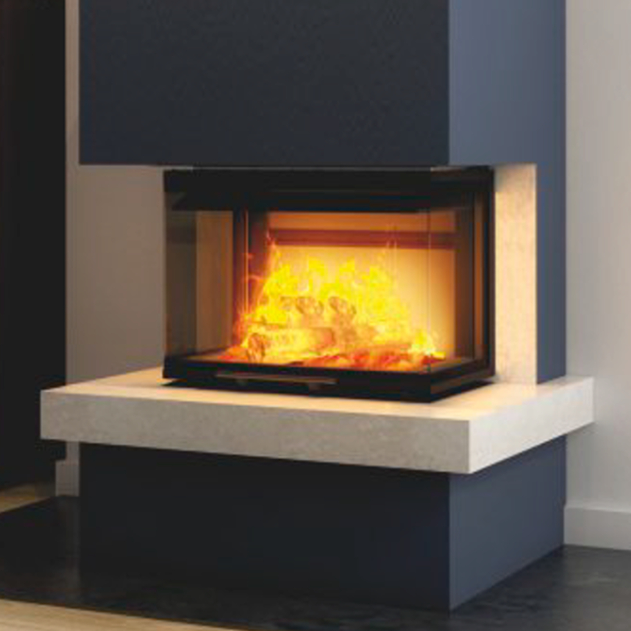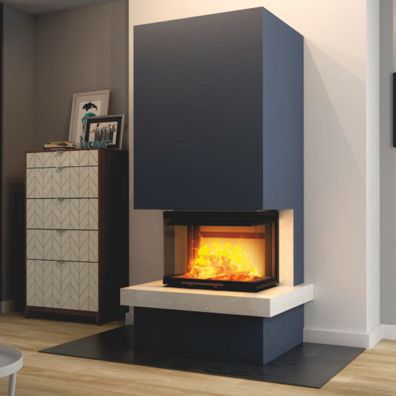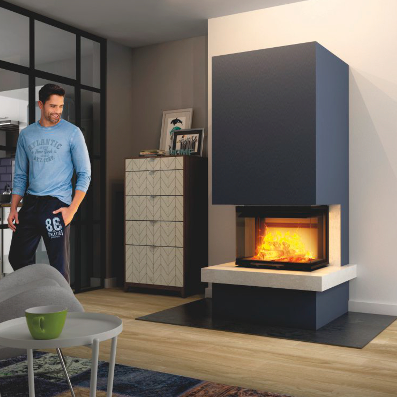 - Modell: Hajduk Smart 3XTH, Warmluft-Eckkamineinsatz, dreiseitige Verglasung, Hebetür
