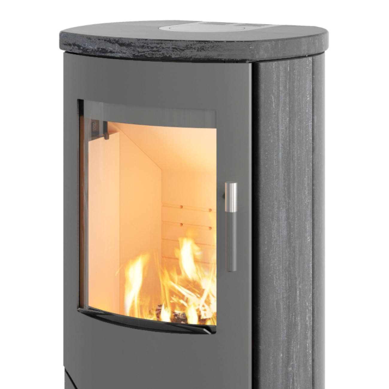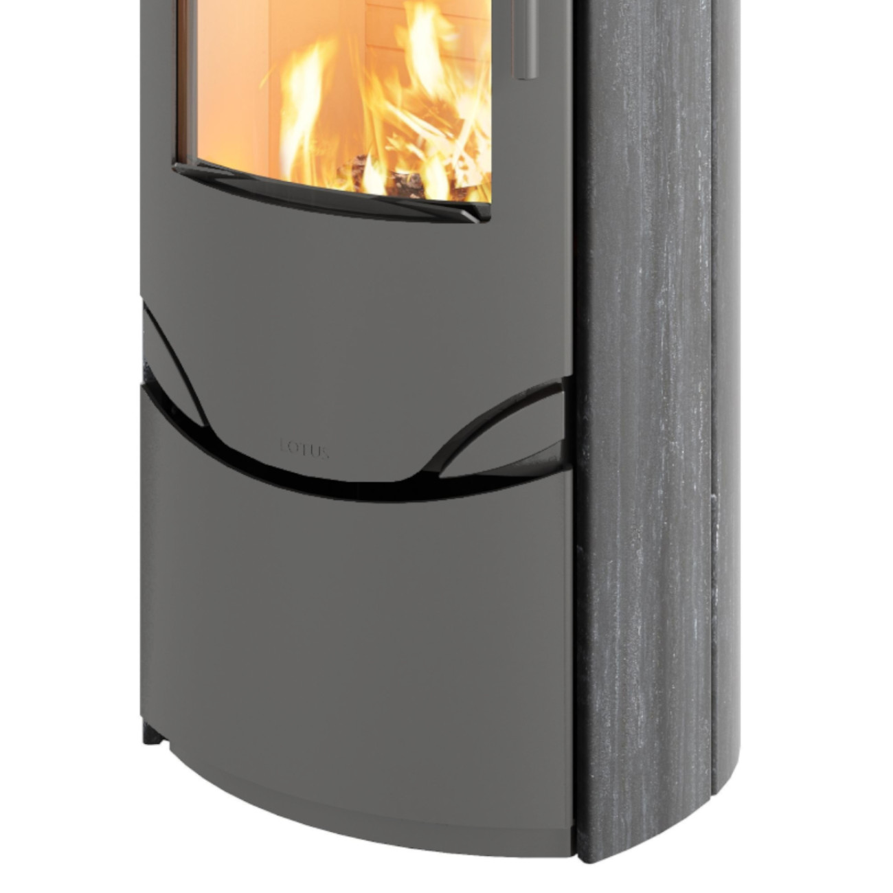 Der Kaminofen Lotus Prio 5 Indian Night überzeugt durch seine abgerundete Front in Grau, eine großflächige Glastür und einen eleganten Türgriff. Unterhalb der Tür befinden sich links und rechts zwei dezent integrierte Regler, die eine einfache und präzise Steuerung der Verbrennung sowie des Rüttelrosts ermöglichen.